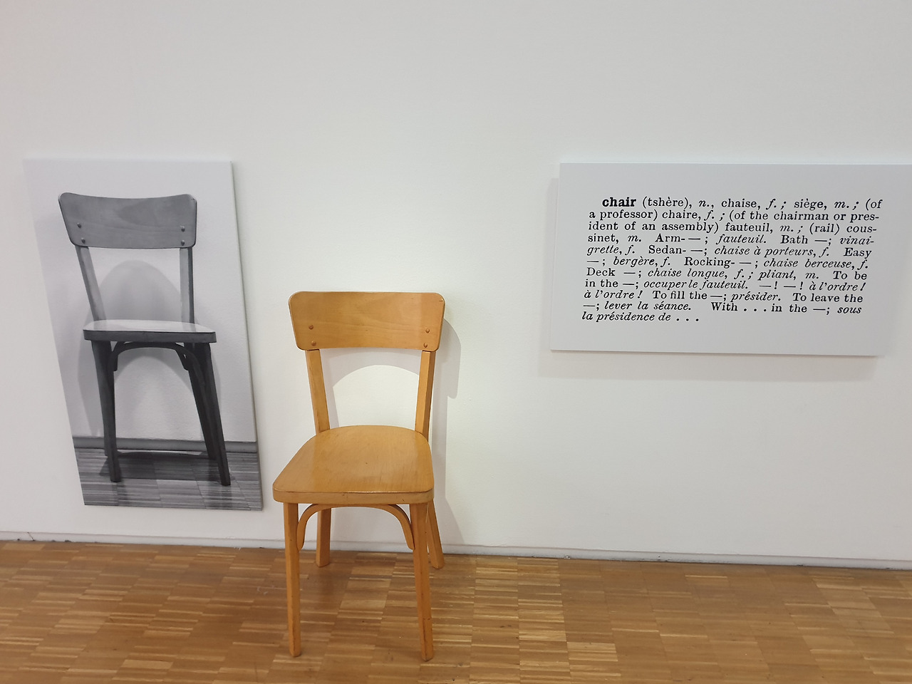 4층에 있는 전시실을 대충 둘러보기만 해도 강의록과 논문의 참고문헌에서 본 작품들이 무더기로 전시되어 있어 감탄하고 있던 중이었다. 특히나 내 눈을 사로잡은 작품은 조셉 코수스의 <하나와 세 개의 의자>였는데, 그건 내가 아주 희미하게 그 작품의 사진을 교과서에서 본 기억이 났기 때문이다. 개념미술작품인 이 작품은 세 개의 파트로 구성이 되어있다. 실물 의자와, 그 의자의 사진과, 의자의 사전적인 정의를 프린트하여 벽에 붙여 놓은 판자. 세 개 모두 우리가 '의자'라고 부른다는 점이 이 작품의 재미있는 관람 포인트라고 할 수 있겠다.