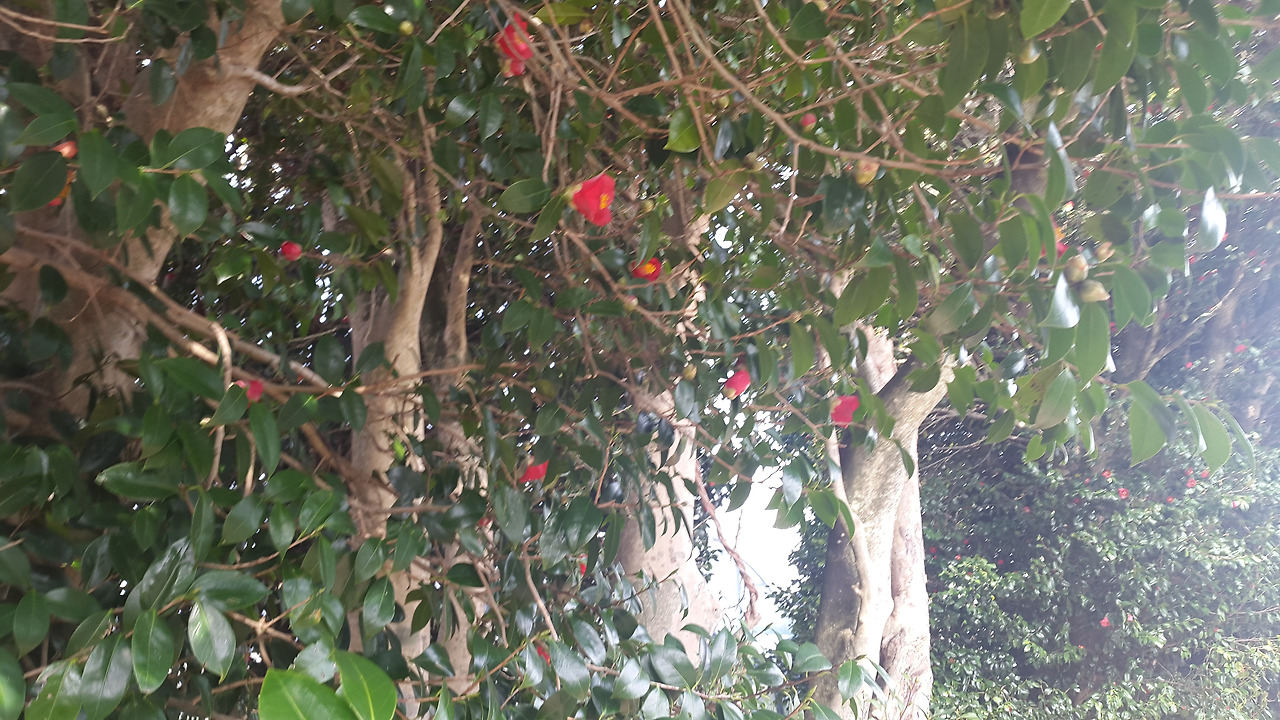 황무지 땅에 부는 바닷바람을 막으려 한라산 동백꽃 씨앗을 부지런히 뿌려 일군 동백꽃 군락을.