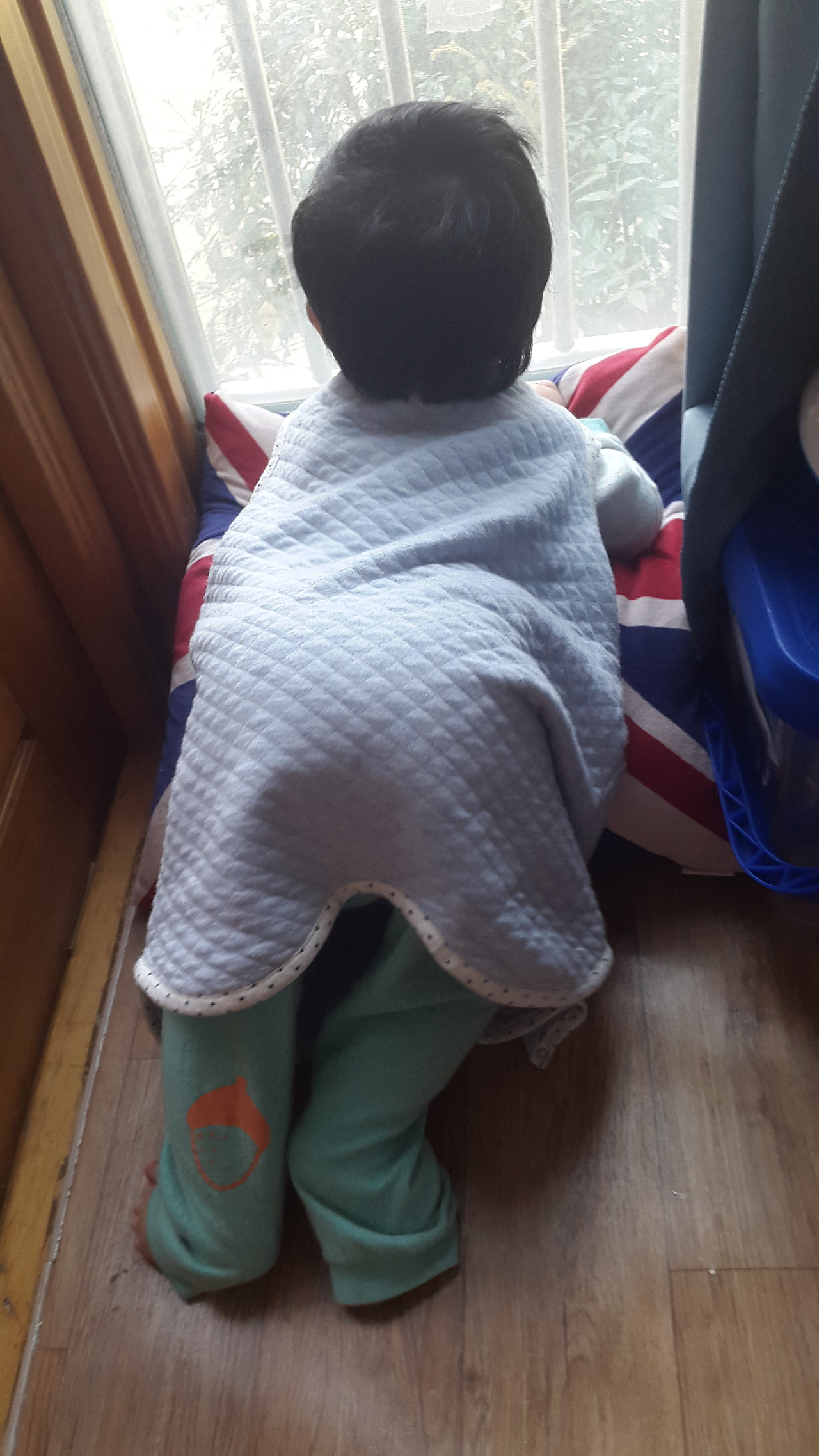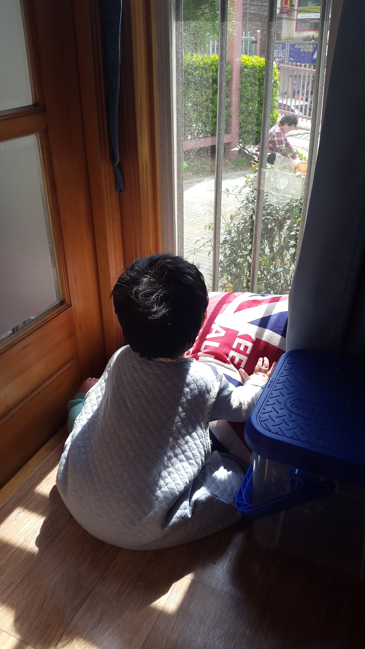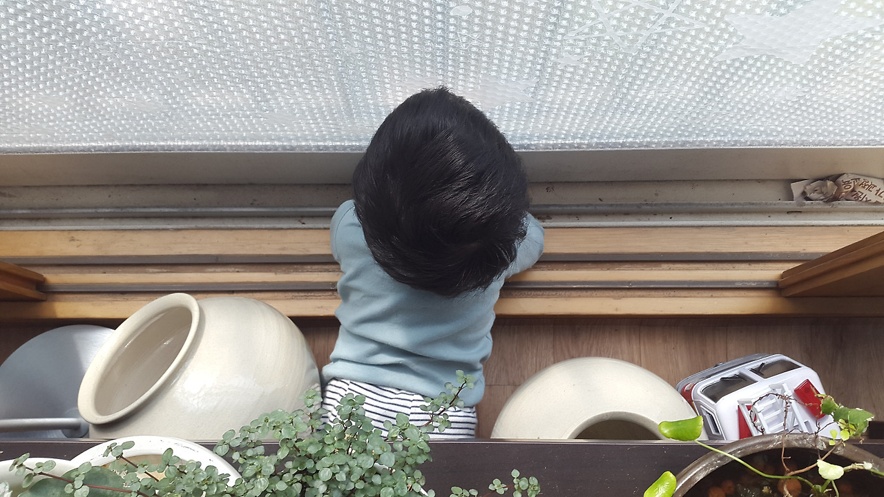 오늘, 295일 된 아들이 햇살이 좋은 날이라는 것을 먼저 알아 채고 거실 창가로 기어갔다. 아파트의 일층. 베란다를 확장해 베란다 창문에 기대면 사람들이 오가는 것도 말소리도 바로 보이고 들려 아들은 고개만 빼꼼 내밀고 열심히 바깥 세상을 향해 이야기를 건낸다.