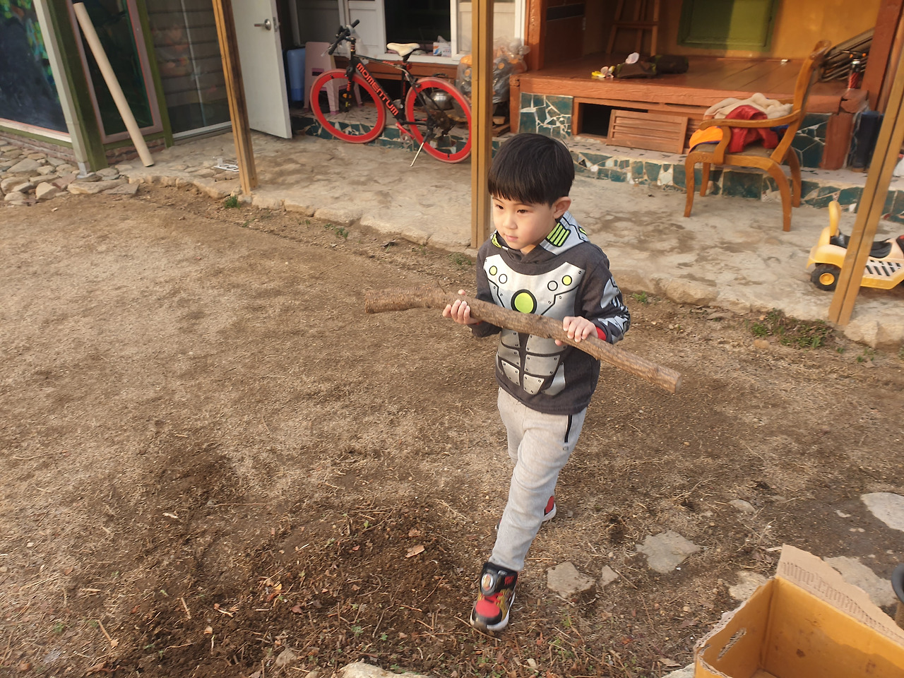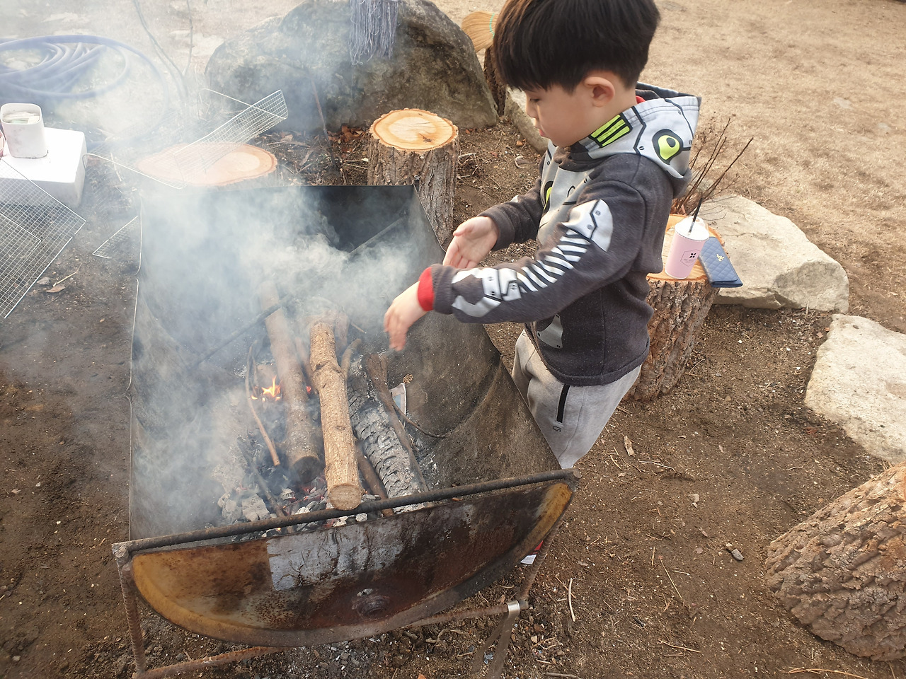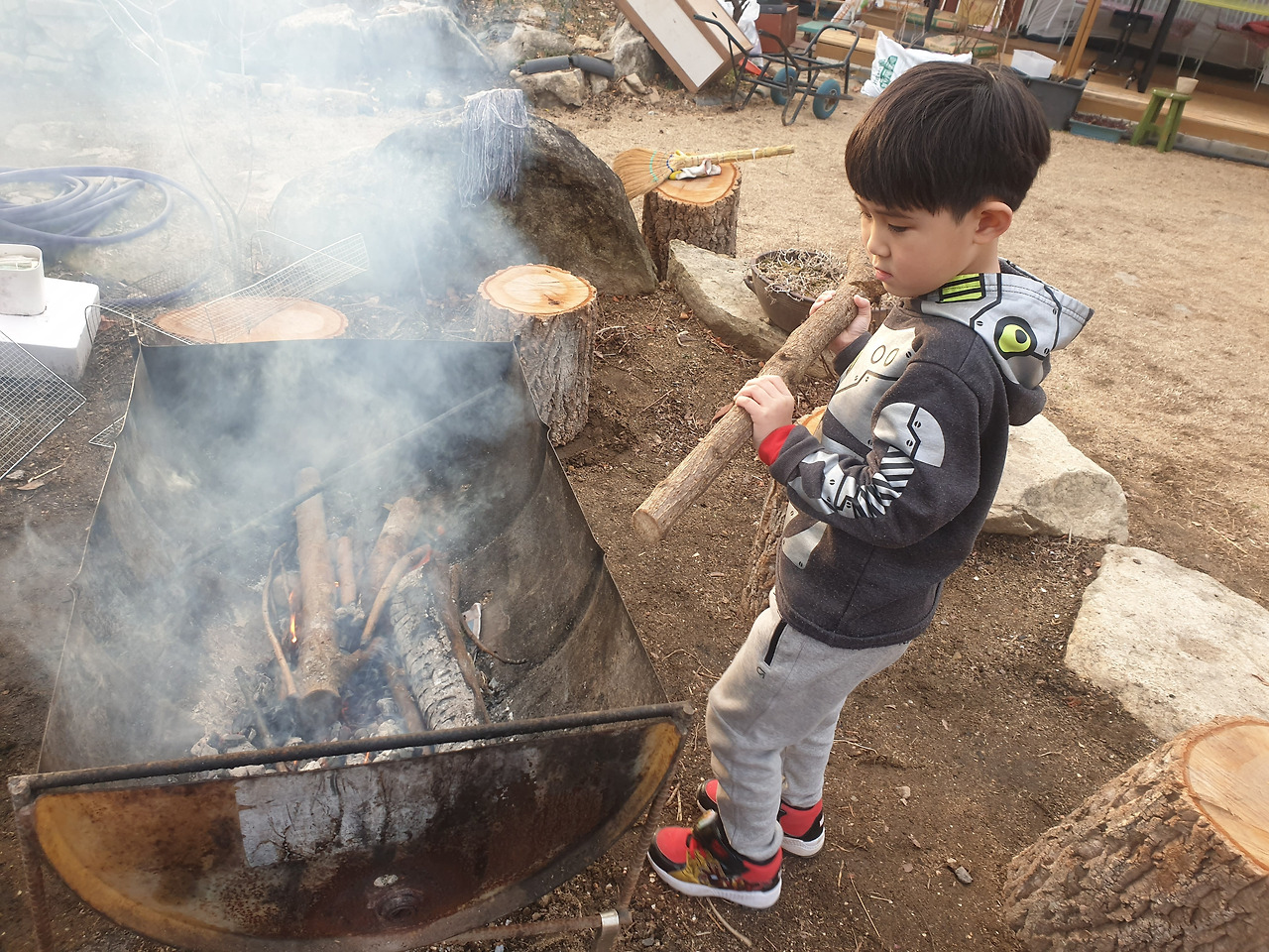 우리는 어두워지기 전에 동네 아저씨에게 믹스 커피 한 잔 타드리고 얻은 드럼통으로 만든 고기구이용 통에 나뭇가지를 넣었다. 불을 지폈다. 불은 조용하고 은근히 3월의 저녁에 타올랐다. 시골에 오면서 아이들은 스스로 자기가 할 수 있는껏 돕고, 위험한 것은 더더욱 조심하며 자기몫을 해낸다.