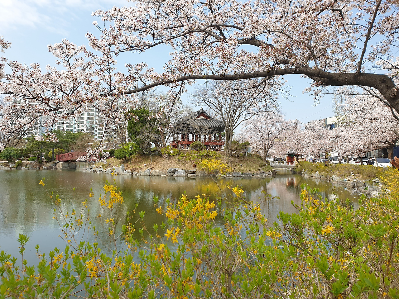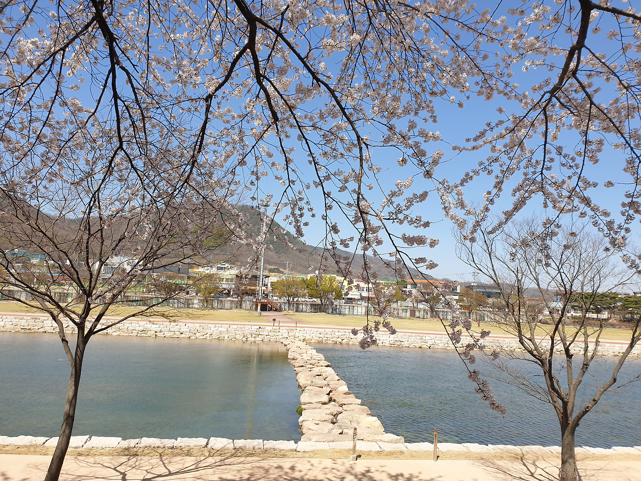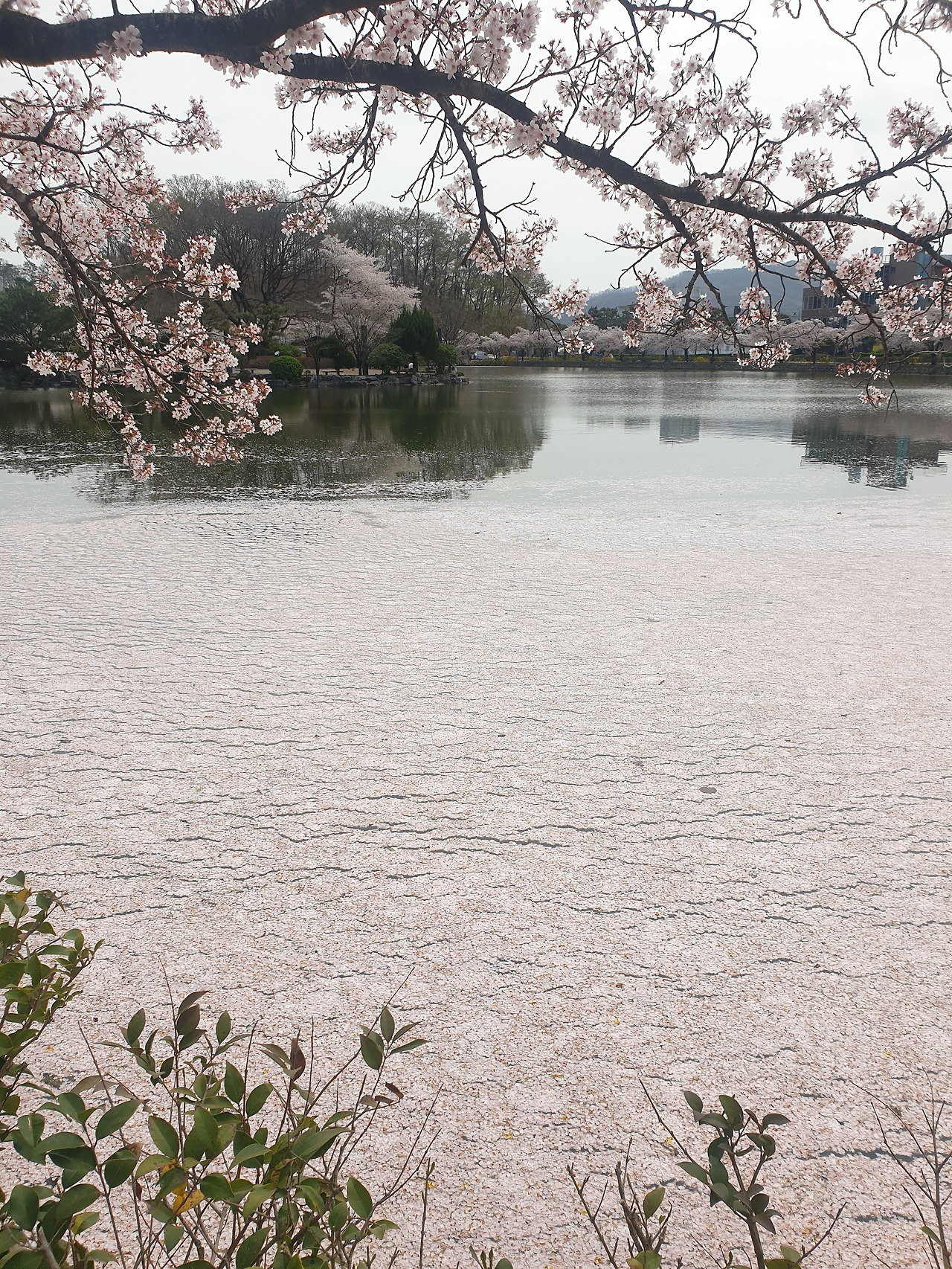 김천역에서 만난 친구와 sns에서 본 벚꽃 명소, 연화지를 찾아 거닐었다. 연화지는 상춘객들로 붐비는 유원지의 요소를 그대로 품고 있었다. 파아란 하늘과 연못을 빙 둘러 심은 벚꽃나무, 꽃놀이 나온 중년층과 학생들.