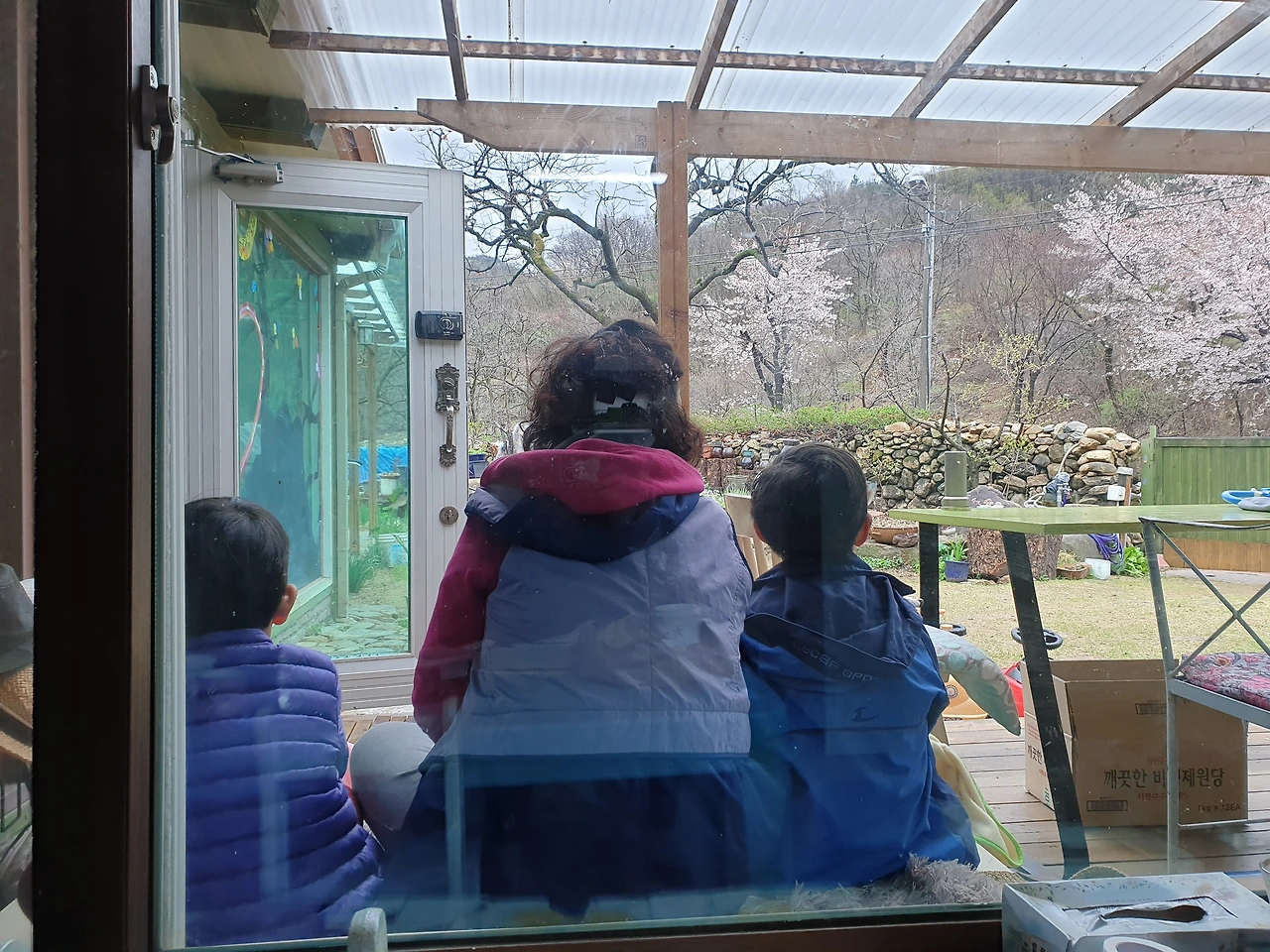 흔쾌히 오케이 해주셔서 우리는 비 오는 처마 밑 데크에 쪼로미 앉아 치킨을 기다렸다. 비가 많이 내릴수록 아저씨가 행여 못 오실까 봐 아이들은 마음을 졸였다. 짧은 순간에 "치킨 언제 와?"를 돌아서면 물어서 결국 진득이 기다리지 못한다고 아이들을 혼냈다. 치킨집 아저씨의 검은색 마티즈가 집 앞에서 경적을 한 번 눌렀다. 너무 감사해 캔커피를 건네자 아저씨는 마당 있는 시골집이 너무 이쁘다며, 배달 빨리 해주고 싶어 서둘렀단 감사한 말도 해주셨다.