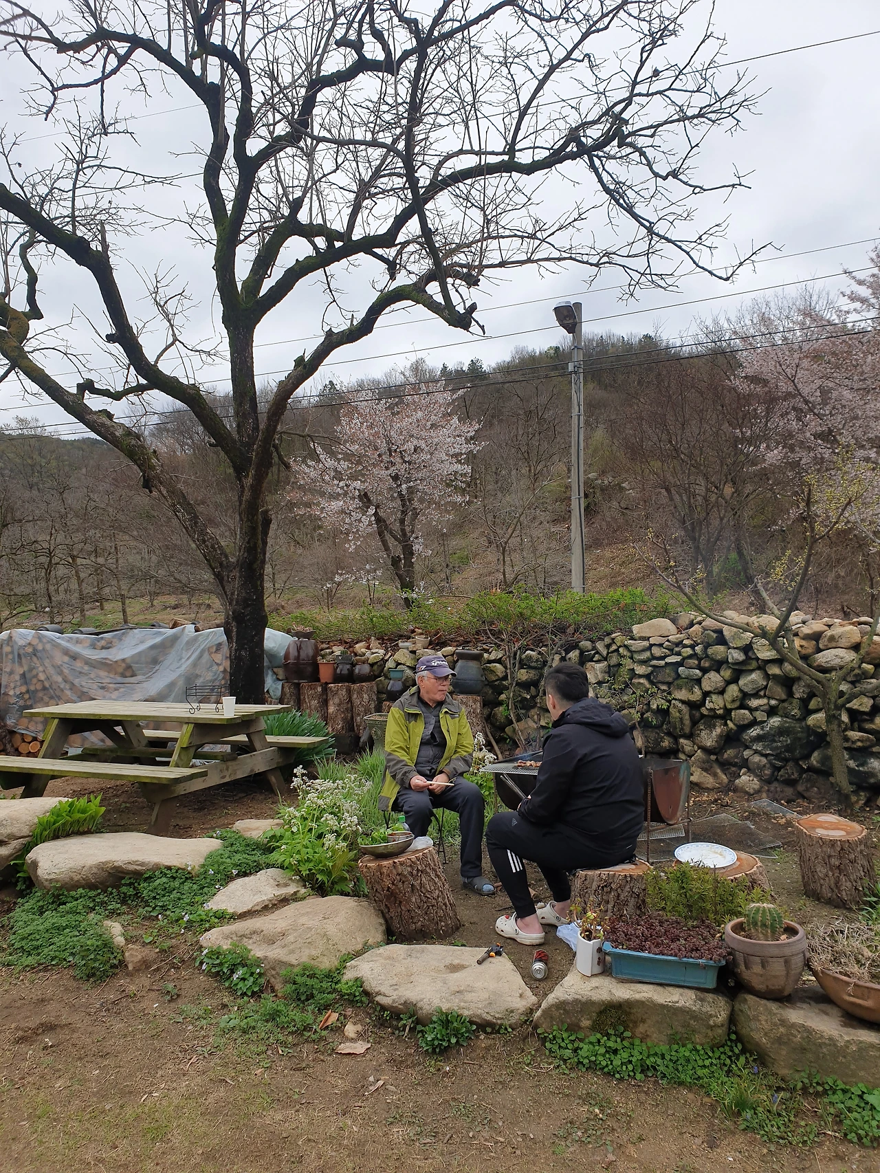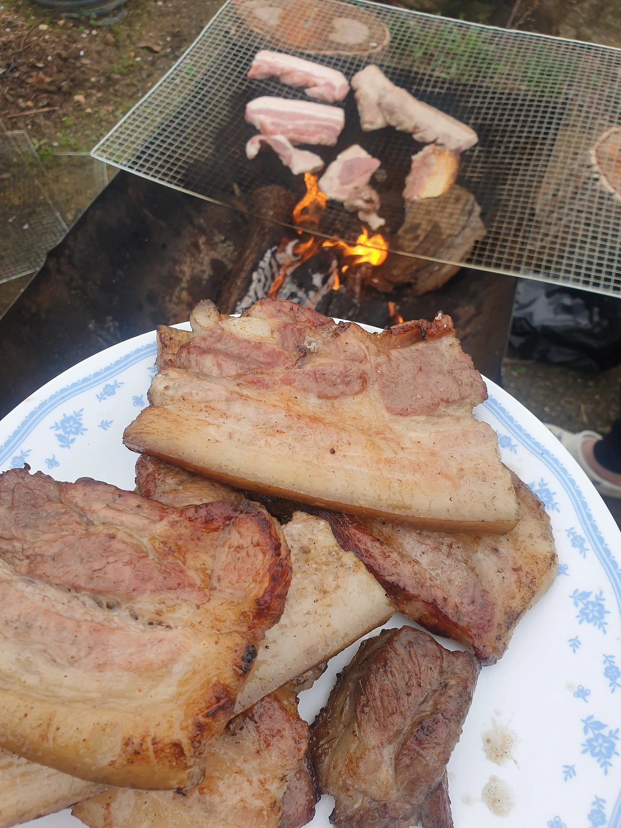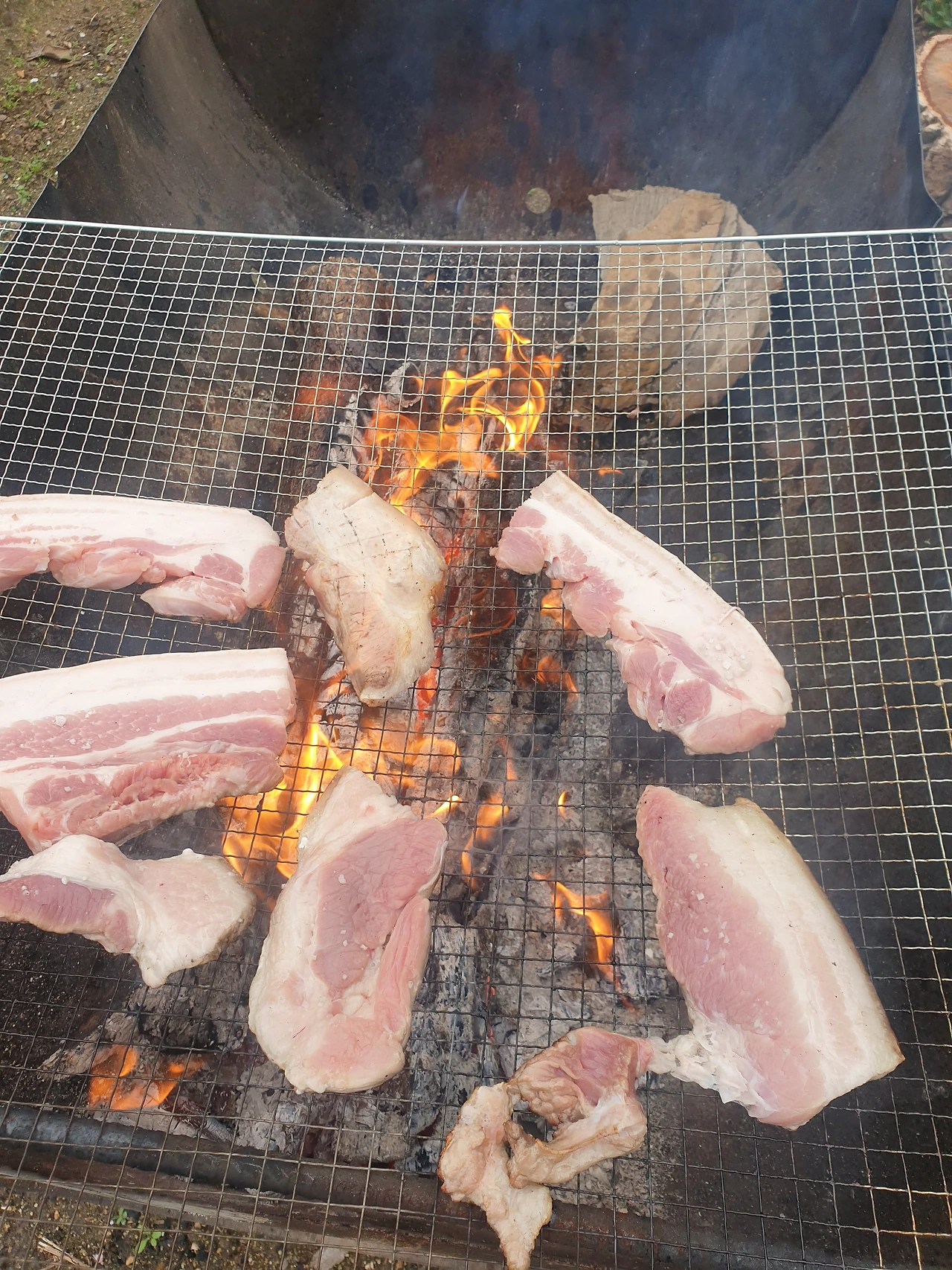 아이들이 유치원에 돌아올 즈음 바람이 불지 않은 비교적 따뜻한 저녁이면 딱 고기굽기 좋은 날이다. 동네 아저씨에게 믹스커피 한 잔 타드리고 얻은 고기구이 드럼통에 아빠 친구에게서 얻은 장작을 넣고 불을 피운다. 그 위에 철망을 올리고 장날 시장에 나가 정육점에서 산 생삼겹살이나 생목살을 올린다. 초벌을 한 고기를 다시 한번 구워내 소금을 살살 부리면 그 맛이 별미다. 이렇게 고기 구워 먹으려고 사람들이 캠핑도 가나 싶을 정도다.