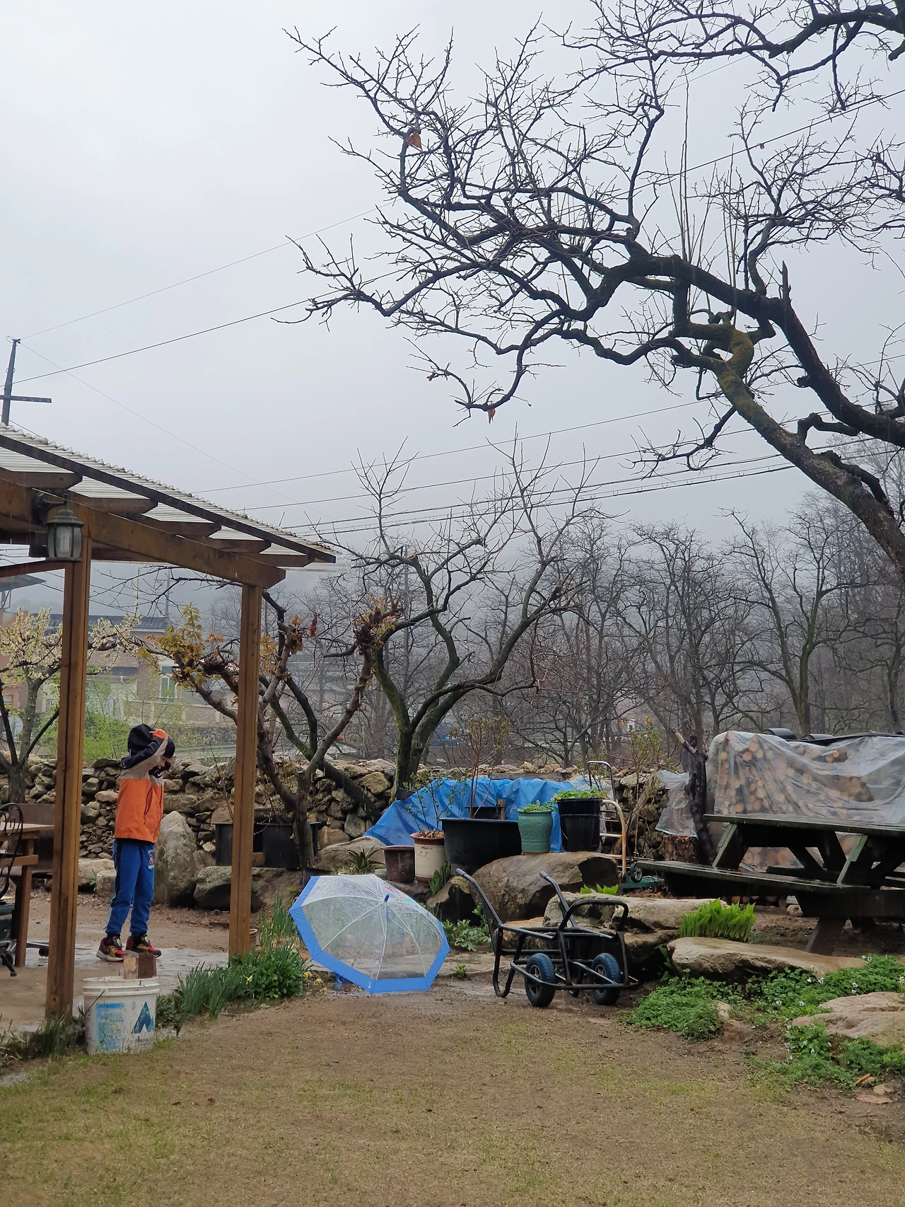 "엄마, 수선화가 비 맞으면 아플까봐 내가 우산 씌워주고 왔어."