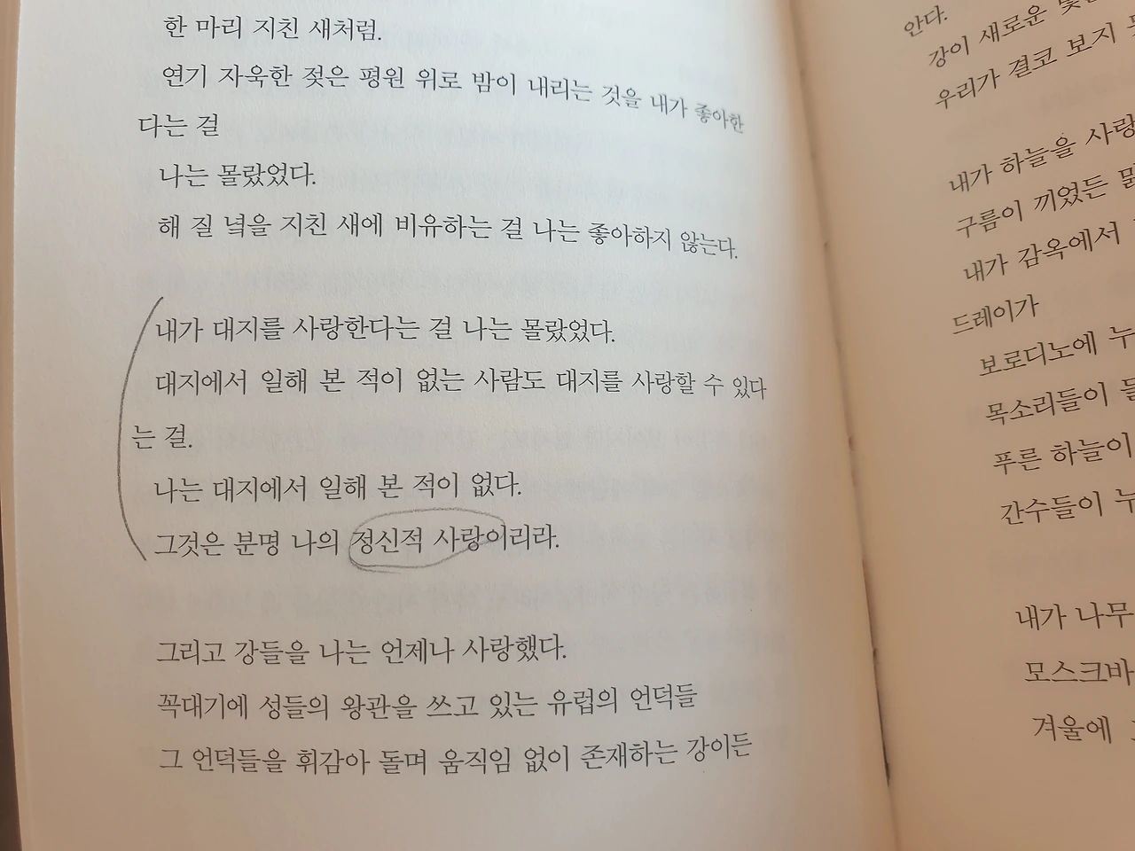 내가 대지를 사랑한다는 걸 나는 몰랐었다. 대지에서 일해 본 적이 없는 사람도 대지를 사랑할 수 있다는 걸. 나는 대지에서 일해 본 적이 없다. 그것은 분명 나의 정신적 사랑이리라.
