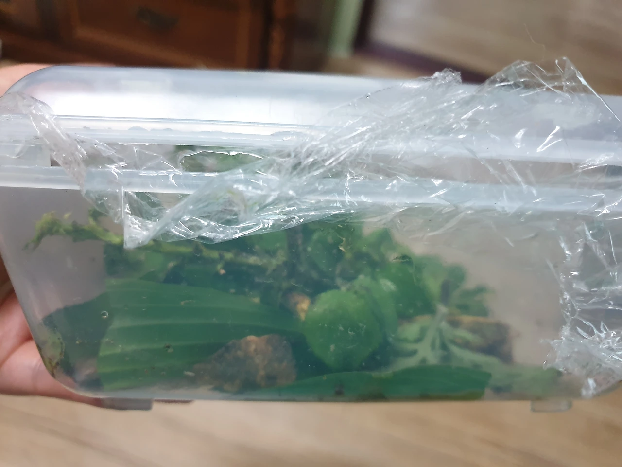 폭신한 나뭇잎을 깔고, 진딧물이 붙어 있는 풀을 꺾어 넣어주었다.
