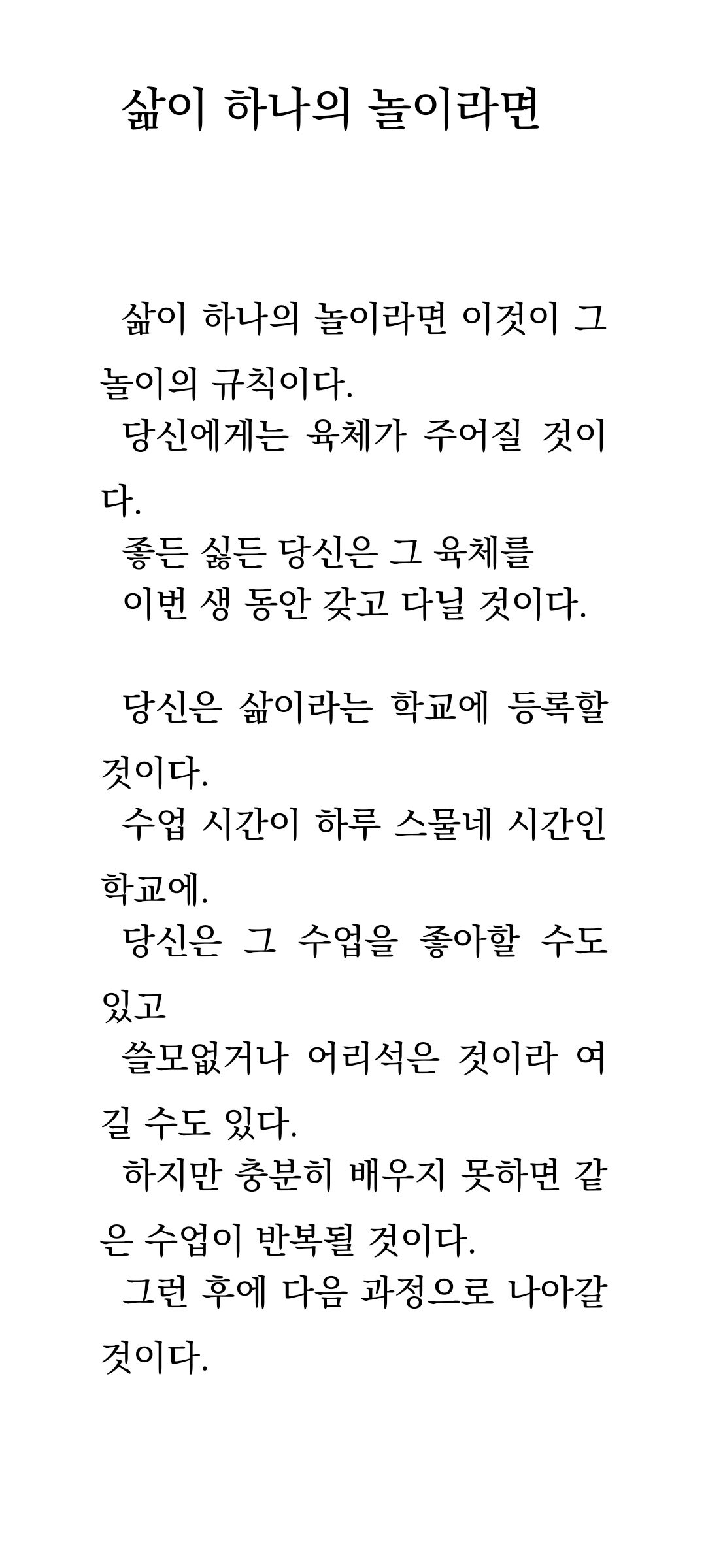 인생과 사랑의 이름은 다르지 않으니. 그도 그리 생각할 거라 짐작해 본다. 우리는 주어진 생에서 하나의 놀이로 배우고 아끼고 보듬으며 나아가다 마침표를 찍을 테니.