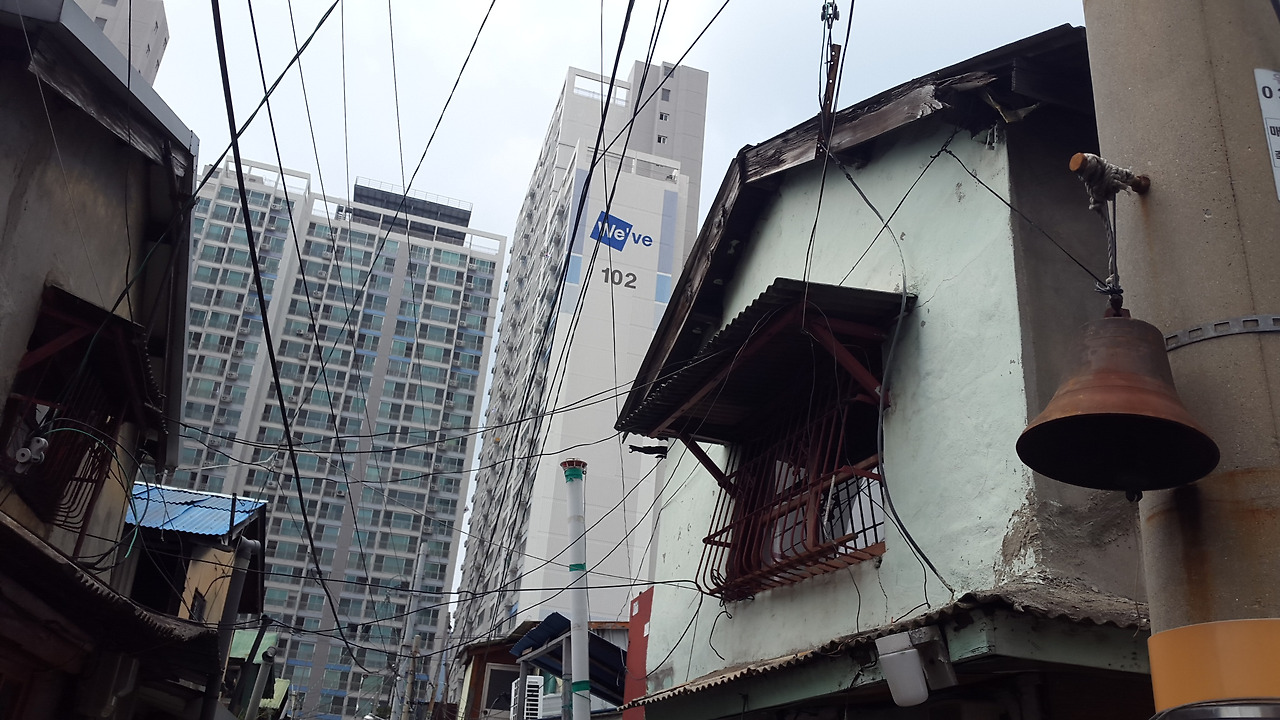 대신 골목 사이로 보이는, 원근법 조차 무시하며 서 있는 고층 아파트가 이고 있는 파란 하늘을 우두커니 서서 바라보며 있었다.