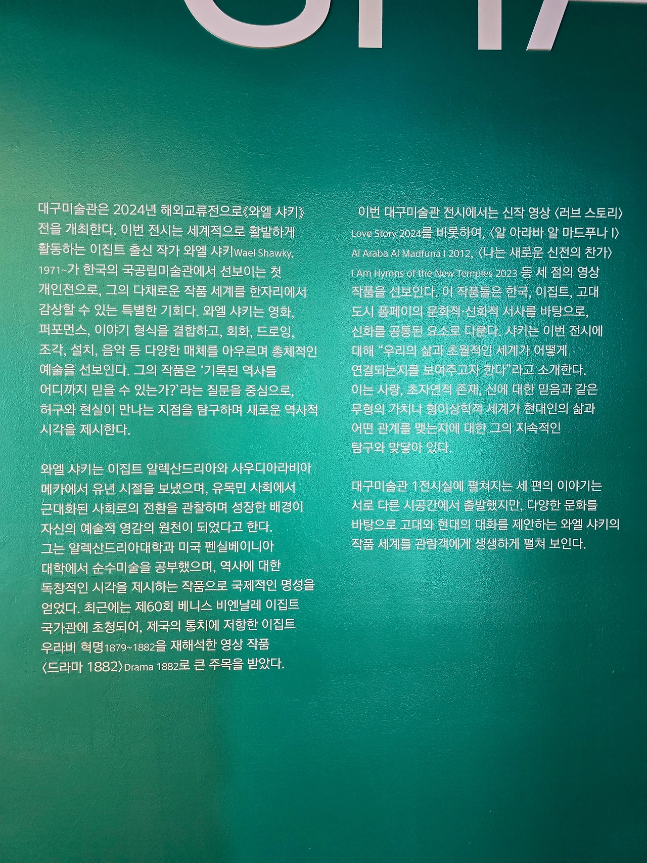 한국의 전통문화를 ‘메탈 그린 컬러'와 ‘러브 스토리’로 풀어낸 예술가의 시선에 깊이 공감했다. 역사가가 아닌 예술가가 바라보는 역사는 또 이렇게 창의적이고 아름답구나, 에로스가 아닌 사랑 이야기로 내 마음을 사로잡은 와엘 샤키에게 경의를 표한다. 한국인인 나도 미처 알지 못했던 한국인의 '사랑장'을 발견한 기쁨에 벅차오르는 전시였다.