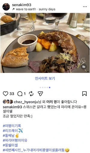 나처럼 불문과를 졸업한 우리 팀 구성원이 "세나님, 몽쉘미쉘은 양고기가 맛있어요. 꼭 드셔보세요."라고 추천했고 덕분에 선택한 저녁 식사도 너무 좋았다:)