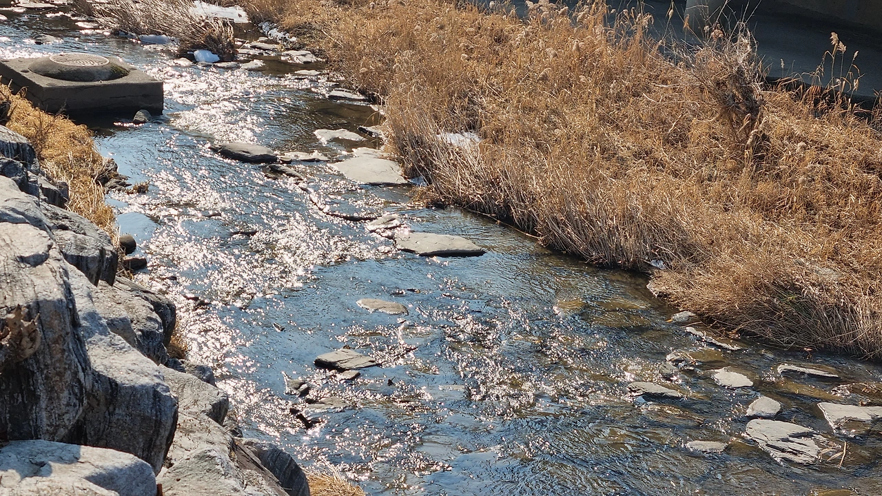 돌과 돌 사이 좁은 물길에서 흐름이 빨라졌고