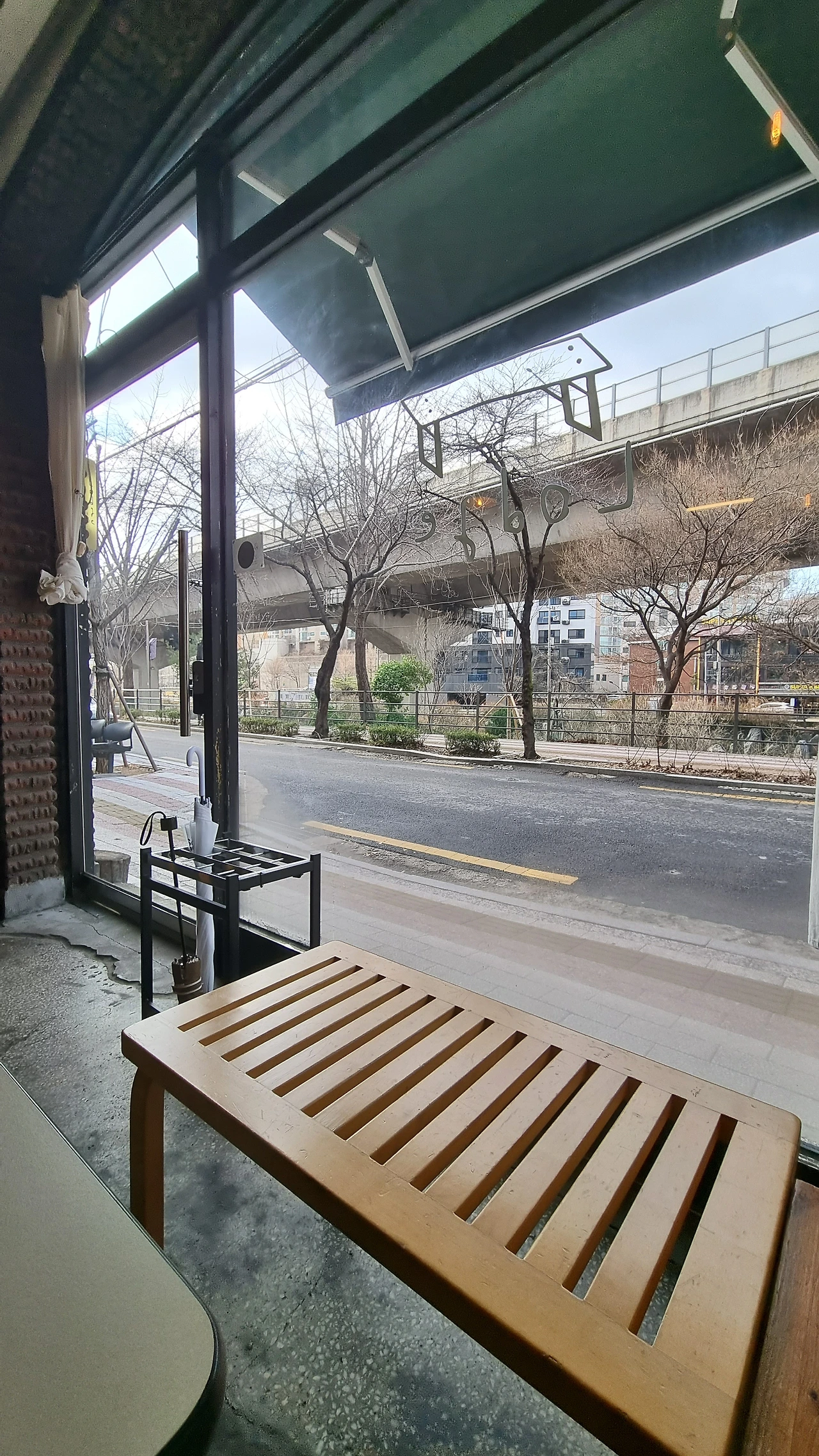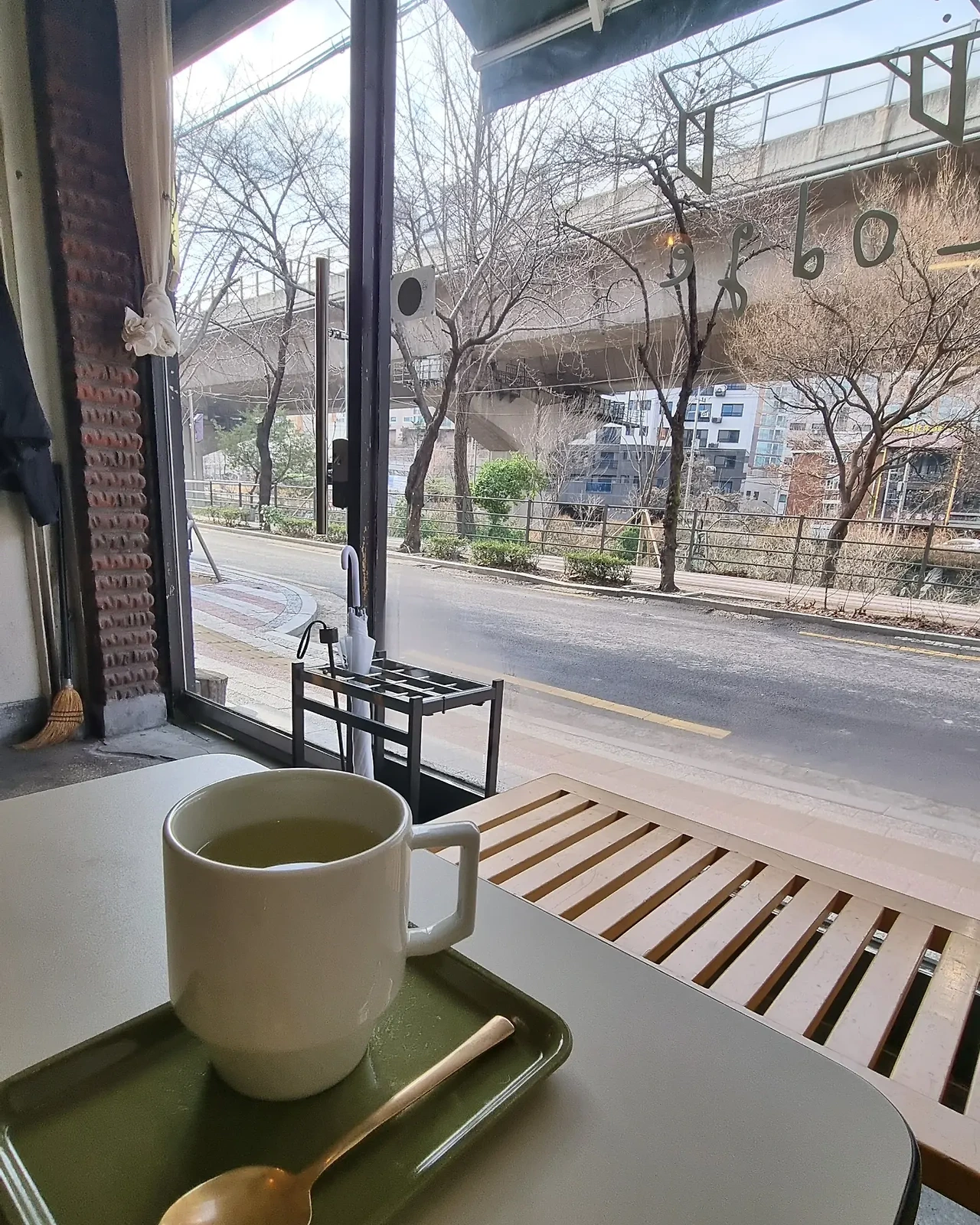 시야가 탁 트인 창가 자리. 눈을 가늘게 뜨고 창밖을 맘껏 감상한다. 벚꽃이 피면 혼몽하겠다.
