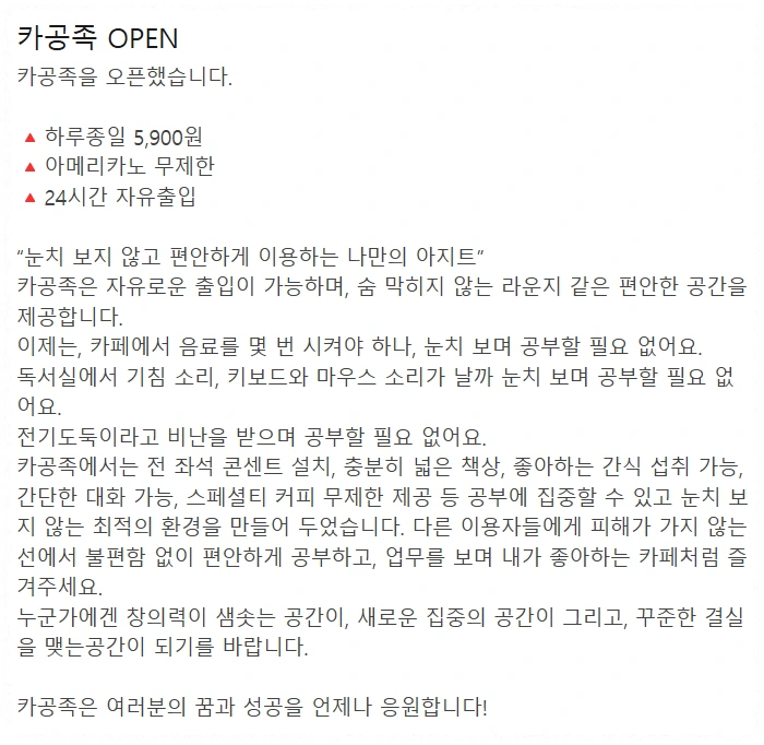 네이버에 카공족을 검색했을 때 '새로오픈'이라는 빨간 글씨가 많이 보이는 것으로 보아 비교적 최근 지점을 폭발적으로 늘리고 있는 듯 보이는데요. 이름처럼 공부하는 카페입니다.
