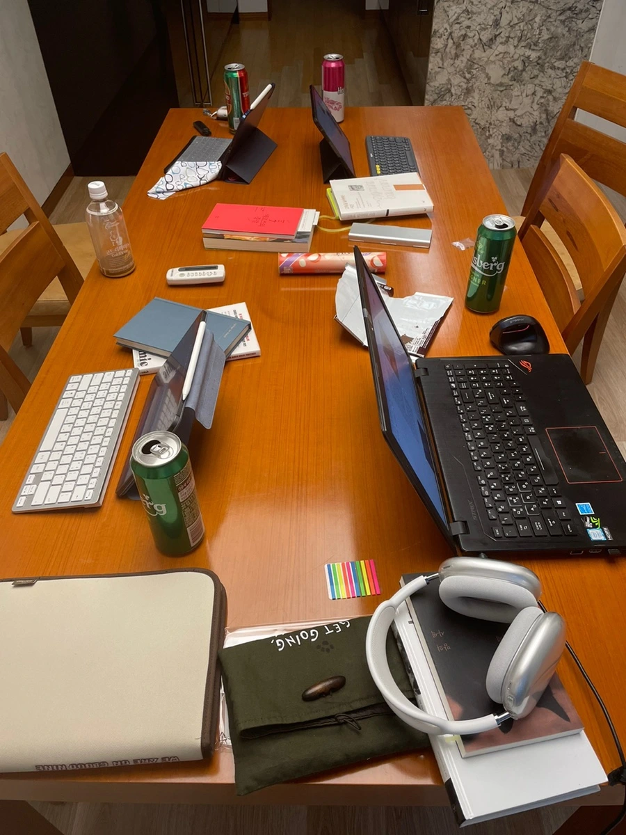 '독서모임' 멤버들끼리 떠난 우리의 여름 휴가도 마찬가지다. 별다른 코멘트 없이 인스타그램 스토리에 올려진 책상 사진은 우리가 단순한 휴가를 떠난 게 아님을 증언한다. 나는 이처럼 내가 '진짜' 독자처럼 보이는 사진을 좋아한다. 음울한 서적 내지를 플래시 터뜨려 찍어 올리는 '가짜'들과는 달라 보이고 싶기 때문이다. 아무렇게나 흐트러진 책상 위의 모습은 막 찍었는데 멋지다는 이미지를 자아낸다. (그렇게 느껴졌으면 좋겠다.) 혹은 정성들여 찍었다는 인상을 주지 않기 위한 장치이기도 하다. 세상에 '노력했는데 구림'만큼 힙하지 않은 것도 없으니까.