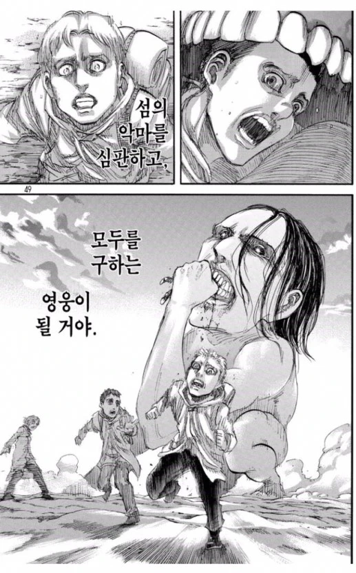 후자는 인간에게 부여된 원죄와 닮아 있다. 우리의 역사를 돌아보면, 분명히 악인은 죽고 어떤 시절은 지나감에도 비극은 반복돼왔다. 거인을 계승하지 않으면 새로 태어날 누군가에게 거인의 힘이 부여된다는 설정은 뿌리뽑을 수 없는 세상의 악하고 잔혹한 부분이 자연법칙처럼 존재함을 보여준다.