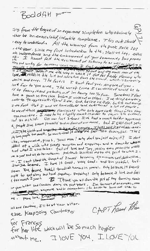 이는 커트가 포크 가수 닐 영의 노래 My My & Hey Hey 에서 따온 구절이다. 아직까지 커트 코베인의 죽음에 관한 의견은 여러 가지로 나뉘지만, 수많은 낭설의 진위여부를 떠나 유서 속 이 가사는 심금을 울린다. 이유는 역시 문장이 그의 삶과 너무도 닮아있기 때문일 것이다.