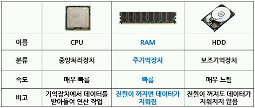 컴퓨터는 비휘발성 메모리인 하드디스크(혹은 SDD)와 휘발성 메모리인 RAM으로 저장 방식이 구분된다. 이를 우리 인간에 빗대면 하드디스크는 '메모'가 되고, RAM은 '기억'이 된다. RAM은 컴퓨터가 켜져 있는 동안에 여러 프로그램들을 활용하여 작업하는데 즉각적인 도움을 준다. 마치 우리가 전화번호 7자리를 잠깐 동안 외워서 다른 사람에게 전달하는 것과 같이 말이다. 다만, 컴퓨터가 꺼지면 이때 수행했던 작업내용들이 모두 사라진다.