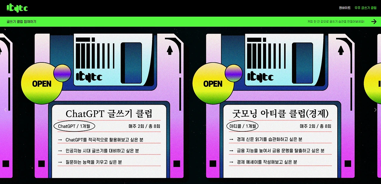원바이트가 Writing Creator를 양성하기 위해 처음으로 시도하는 활동은 '글쓰기 모임'입니다. 현재 <독서 글쓰기 클럽>, <ChatGPT 글쓰기 클럽>, <경제 에세이 쓰기 클럽>을 운영 중이며 앞으로도 다양한 주제를 다루기 위해 양질의 글쓰기 클럽을 오픈할 예정입니다.
