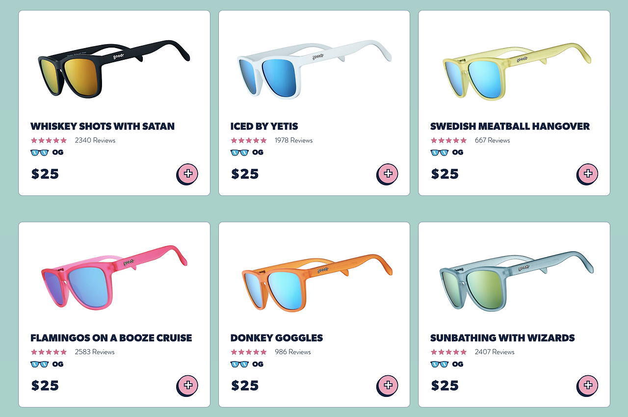 하지만 그들은 마케팅 예산이 없다는 점을 단순히 가격 경쟁으로 해소하려고 하지 않았고 '지루한 스포츠 선글라스 시장에 유쾌함을 더하겠다'는 브랜드 미션 속에서 자신들이 할 수 있는 최선의 브랜딩 전략을 모색했습니다. 예컨대, 제품명을 소비자들이 이해하기 힘든 정체불명의 코드로 표기하는 것이 아니라 "플라밍고들이 술 마시며 유람선을 타는 중(Flamingos on a Booze Cruise)"과 같이 유쾌한 네이밍을 적용하였고 이를 통해 제품을 사용하는 소비자들이 제품을 통해 자신의 아이덴티티를 표현할 수 있도록 도왔습니다.
