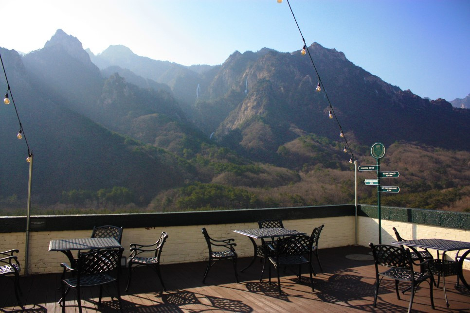 체크아웃 전에 굳이 이곳을 방문한 이유는 모닝커피가 간절했기 때문도 있지만 설악산을 한눈에 담을 수 있는 테라스를 보기 위해서였다. 비틀즈로 가득한 그곳에서 설악산을 바라보니 마치 런던의 펍에서 융프라우를 바라보는 듯했다.