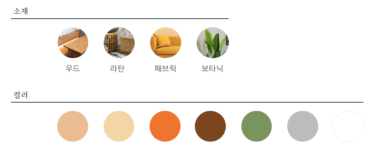 리모델링 방향성을 잡기 위해 사전에 집의 특질을 파악한 결과, 우리 집은 따뜻한 이미지를 가지고 있다는 점을 알게 됐다. 그래서 이러한 따뜻한 이미지를 잘 살리기 위해 차가운 이미지를 가지고 있는 컬러, 소재를 하나씩 배제하고 따뜻함을 전달하는 컬러, 소재를 리스트업 했다.