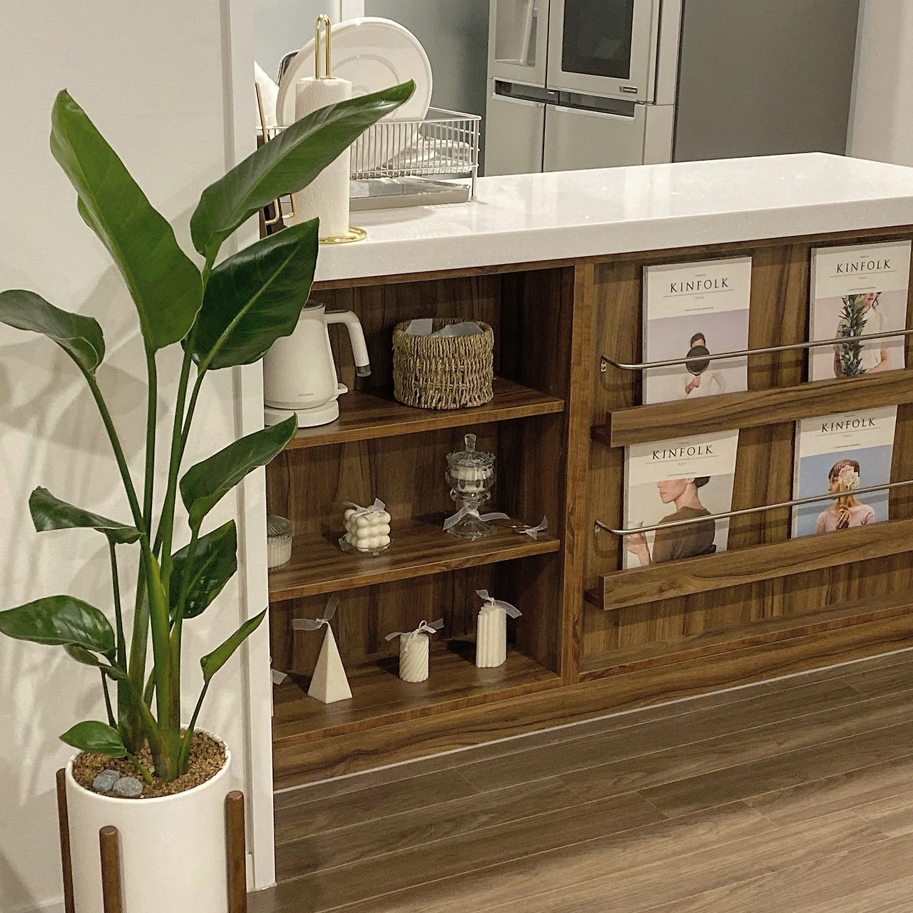 나는 리모델링된 아일랜드 식탁의 심미성을 더욱 높이기 위해서 고심했고, 그 끝에 킨포크 잡지를 매거진랙에 꽂고 진열장에는 디자인 향초를 미니멀하게 진열했다. 그리고 인스타 콘텐츠용 사진을 찍을 때는 정사각형 앵글 안에 지저분하게 들어오는 요소가 없도록 물품들을 재정렬했다.