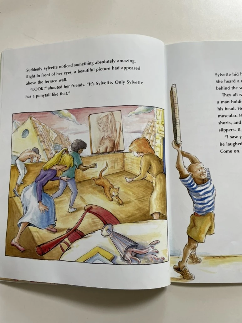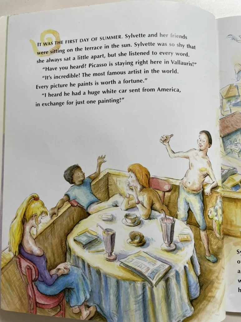 실베트는 발로리스Vallauris에서의 여름의 어느날, 테라스에서 친구들과 놀고 있던 중 미국에서 유명한 화가 피카소가 그녀의 마을에 왔다는 소식을 듣게 됩니다. 평소 그림그리는 것을 좋아했던 실베트는 이 소식을 듣고 흥미로워 하죠. 그러던 중 갑자기 피카소는 테라스에 앉아있던 실베트와 친구들에게 다가와 포니테일을 한 여성의 사진을 들이밀며 이들에게 대뜸 "너희들을 내 작업실에서 지켜 봤단다. 내 작업실 구경하지 않으련?" 이라고 말합니다. 그래서 실베트와 친구들은 그의 작업실에 방문하게 되죠.