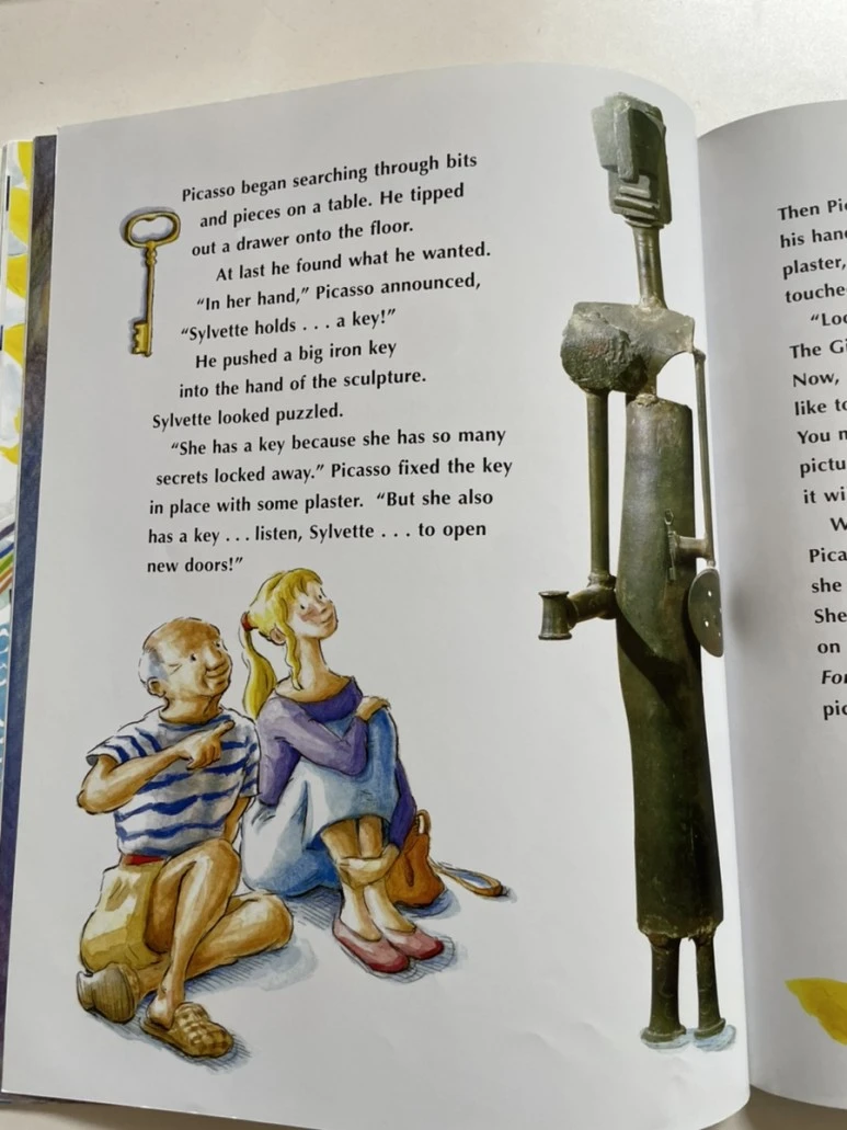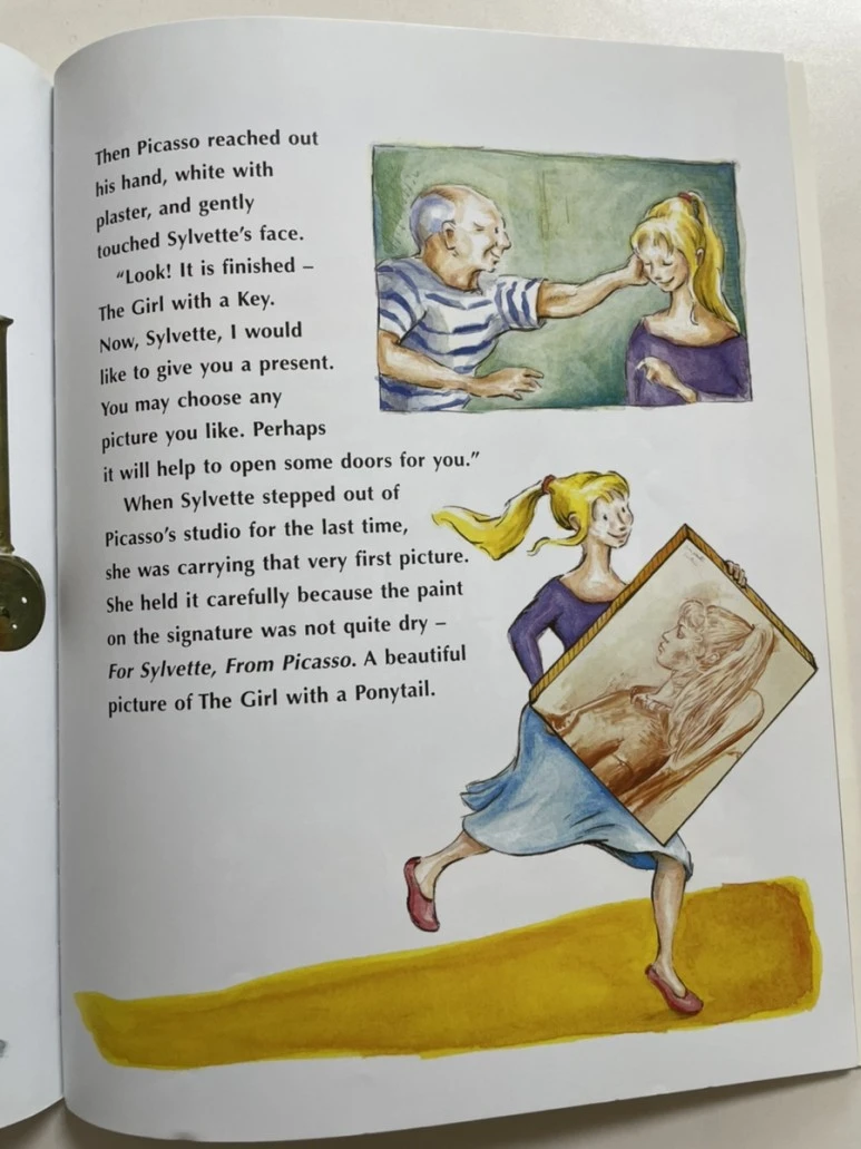 피카소는 서랍을 뒤져 "열쇠"를 찾았고 실베트 조각상의 손에 열쇠를 쥐어 줍니다. 그리고는 이렇게 말하죠 "실베트는 문을 열어야 할 많은 비밀들을 가지고 있지. 하지만 이 열쇠를 쥐고 있기 때문에 새로운 문을 열 수 있단다" 그러고나서 피카소는 실베트의 얼굴을 쓰다듬으며 조각상 <열쇠를 쥔 소녀>를 마무리 했으니, 그녀에게 가지고 싶은 그림을 하나 고르라고 하죠. 그리고 이 그림이 아마 그녀에게 새로운 문을 열어줄 것이라고 말합니다. 실베트는 "for Sylvette from Picasso'라고 그려진 아름다운 그녀의 초상화를 고릅니다. 피카소의 작업실에서의 마지막 날, 그녀는 그녀의 얼굴이 그려진 그림을 들고 작업실을 나오게 됩니다.