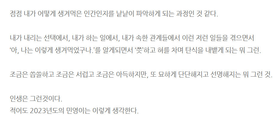 올해 나는 나의 부족함과 문제점을 낱낱이 보게 되는 경험을 많이 했다. 이 과정은 정말이지 토 나올 정도로 힘들었다. 하지만 분명한 건, 나는 묘하게 선명해지고 단단해졌다. 부족함, 무지를 받아들이고 이를 해결하는 과정은 무척이나 고통스럽지만, 견디는 과정을 통해 가치 있는 것을 얻을 수 있다는 마크 맨슨의 말은 내가 이번 연도에 배운 가치인 "인생은 내가 좋은 인간이 되는 것이 아니라 내가 어떻게 생겨먹은 인간인지를 낱낱이 파악하는 과정이다"의 형체를 파악할 수 있었다.