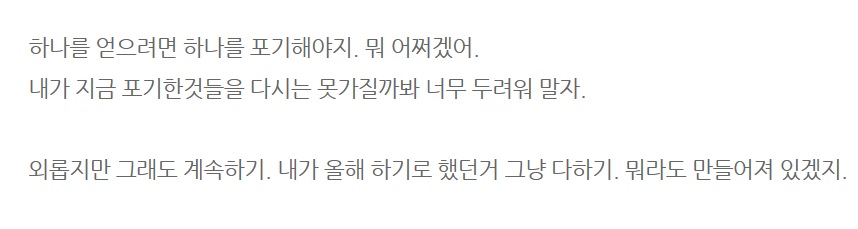 올해 일어난 일들을 통해 나의 부족함, 미성숙함을 상세하게 들여다보면서 부끄럽기도 했고, 수치스럽기도 했고, 후회가 되기도 했다. 근데 미묘하게 스스로가 선명해지고 단단해지는 감각도 느꼈다. 내가 미숙하고, 서툴렀다는 것을 인정하니까 그냥 수긍하게 되는 과정에서 묘하게 자유로워지는 그런 느낌이었다.