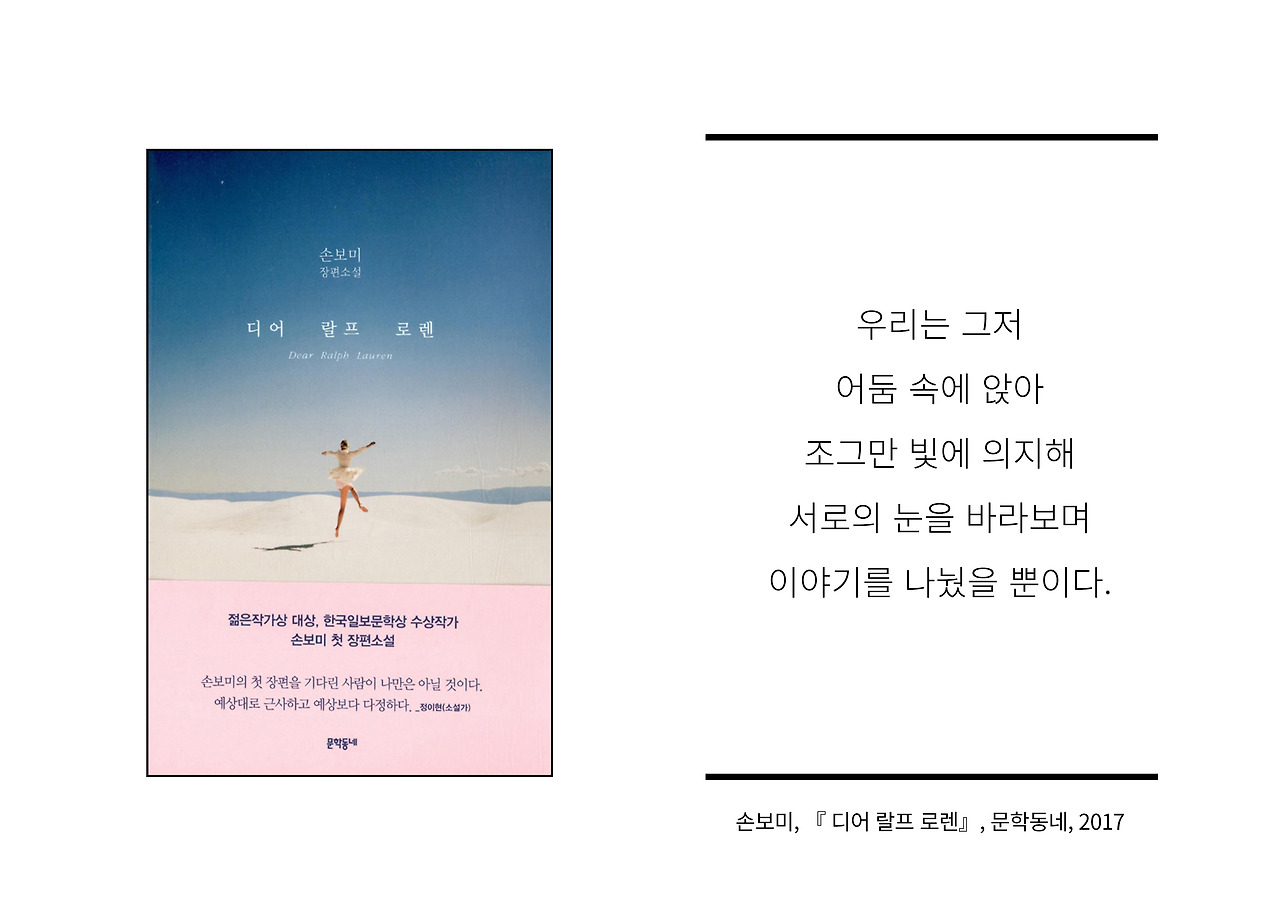 「디어 랄프 로렌」을 이루는 두 축은 '진실'과 '착각'이라 할 수 있어. 둘은 마치 동전의 양면처럼 잘 들여다보면 구분이 잘 가지 않아. 진실이라 믿어왔던 게 착각에 불과했고, 착각하던 것들이 어느샌가 나를 관통하는 진실이 되어있을 때도 있지. 그래서 사람들은 둘 사이에서 길을 잃고 헤매거나 왜곡된 진실에 머물러 있기를 택해. 손보미는 이 소설 안에서 인물들의 일련의 선택들을 근사한 이야기로 만들어 보여주고 있어. 의미 없는 것들, 무용한 것들을 통해.