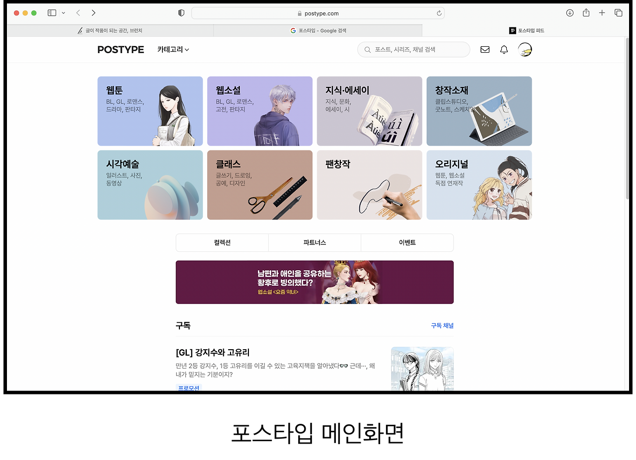 포스타입은 첫 화면에 작품의 분야를 명료하게 나누어 사용자가 원하는 경험을 할 수 있도록 유도한다. 그런데 브런치는 메인 화면의 1/3을 '감성적인' 카피가 차지하게 두고, 어떤 기준에서 선별되었는지 알 수 없는 랜덤한 글들이 나머지 2/3을 채운다. 모바일 화면은 이보다는 낫지만 사용자화되지 않은 무작위의 글이 첫 번째로 눈에 보이는 것은 동일하다. 즉, 브런치는 인스타그램, 트위터, 네이버 블로그, 포스타입과는 달리 첫 화면에서 '내가 원하는 글, 혹은 통로'를 제시하지 않는다.