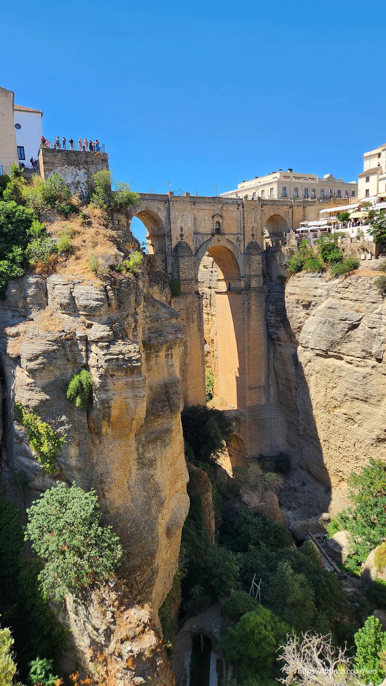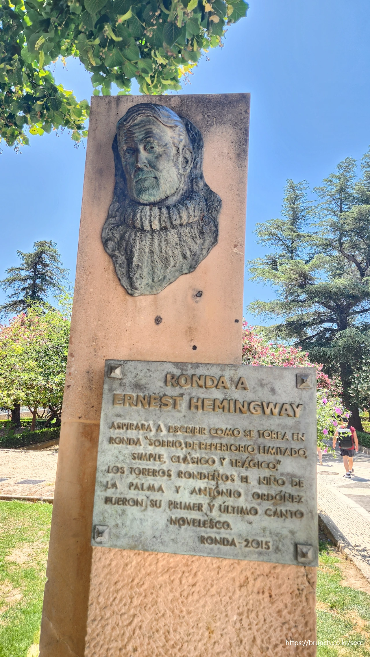 헤밍웨이가 '누구를 위하여 종은 울리나'를 론다에서 썼다는 말은 잘못된 정보이다. 그가 책을 쓴 곳은 쿠바의 자기 집이었고, 스페인 내전을 목격한 경험을 배경으로는 세고비아가 등장다. 론다의 협곡을 가로지르는 누에보 다리를 세고비아의 수도교를 떠올리며 아래에서 담아보았다. 그게 그거 같지만 헤밍웨이가 '누구를 위하여 종은 울리나?'를 론다같은 곳을 배경으로 했다는 것과 론다에서 썼다는 것은 다르기 때문에 바로 잡는다.