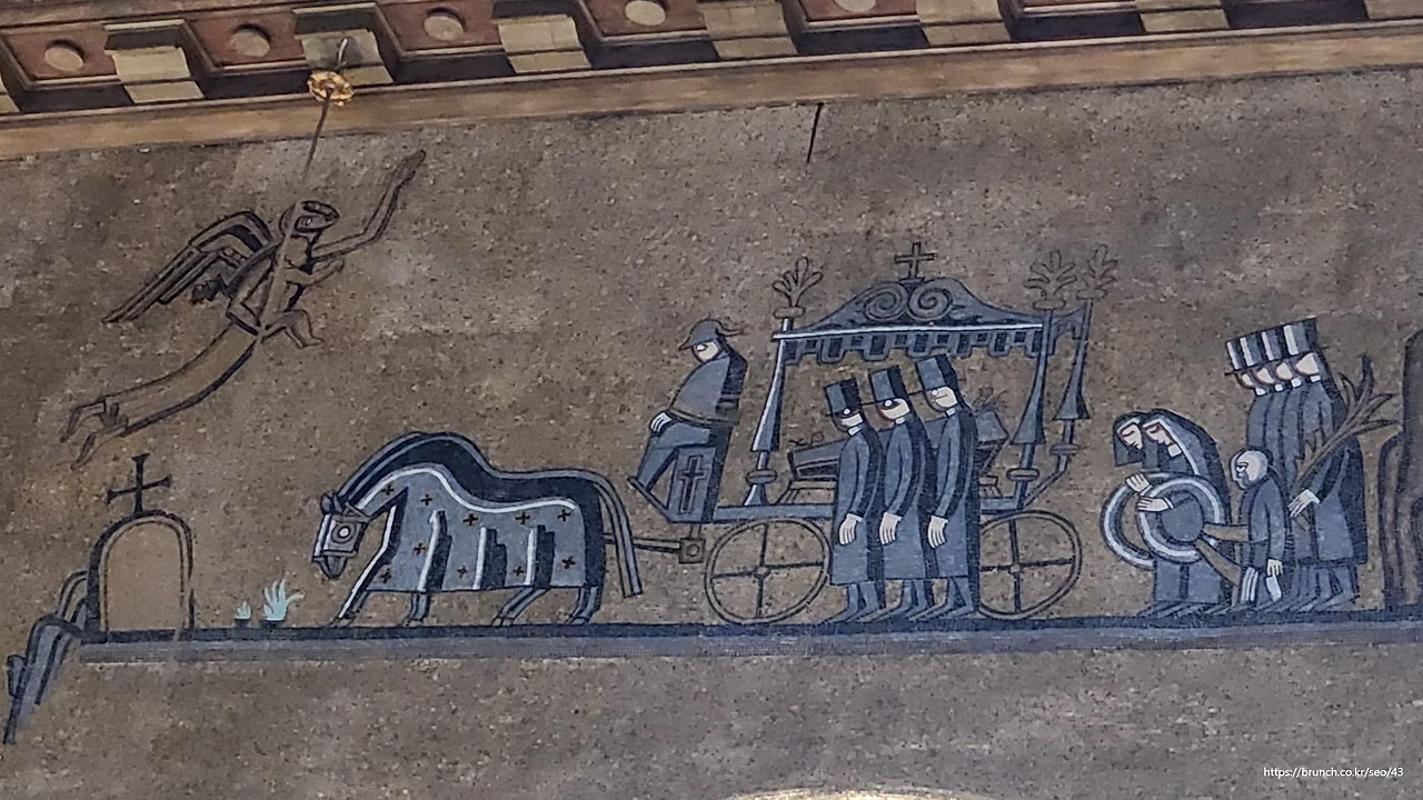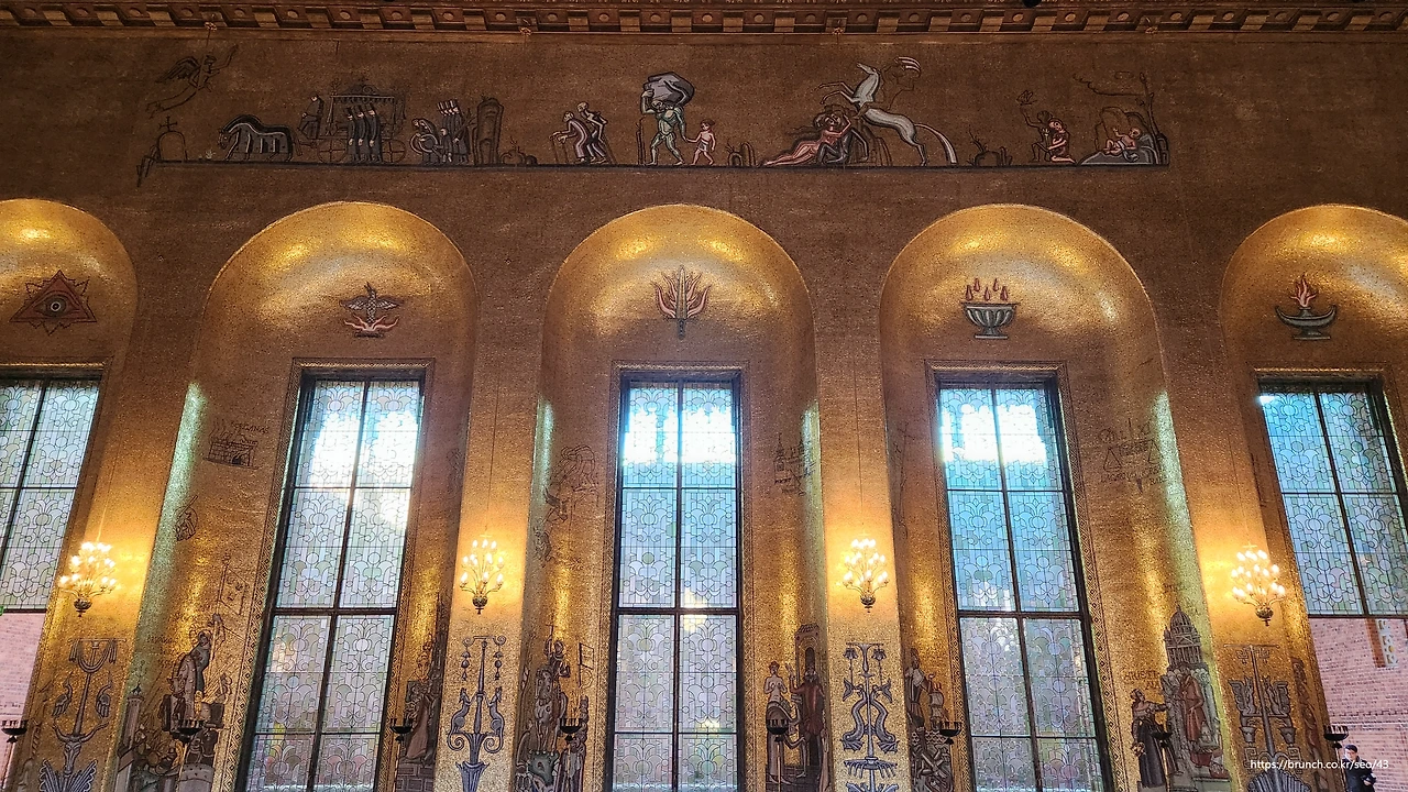 사회복지의 모델이 되었던 스웨덴의 "요람에서 무덤까지"가 그려져 있는 스톡홀름 시청사 내부