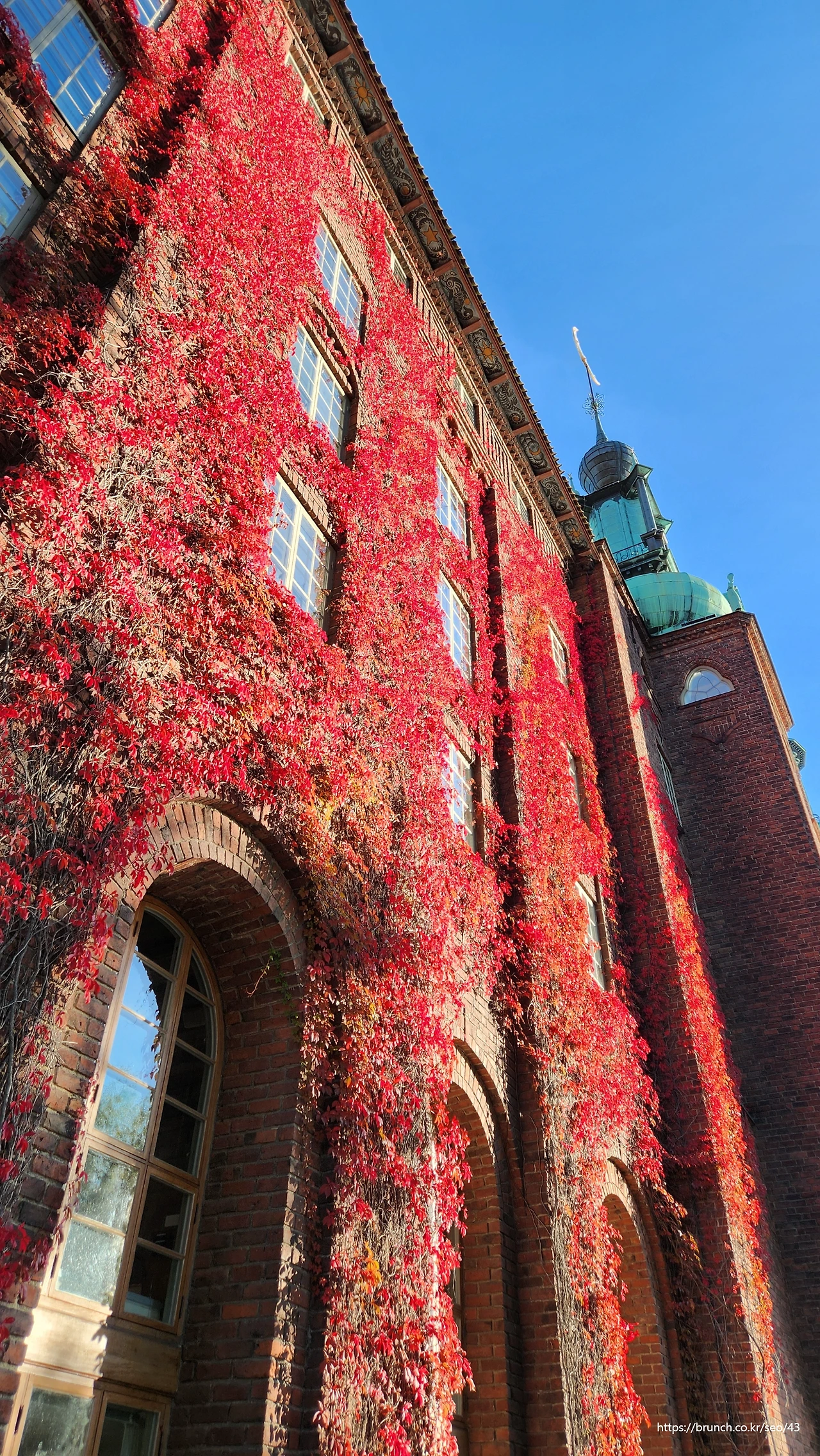 그 푸르던 담쟁이넝쿨은 화려하게 갈아입고 주어진 삶의 마지막 불꽃을 태우며 지금이 전성기라고 선포한다.