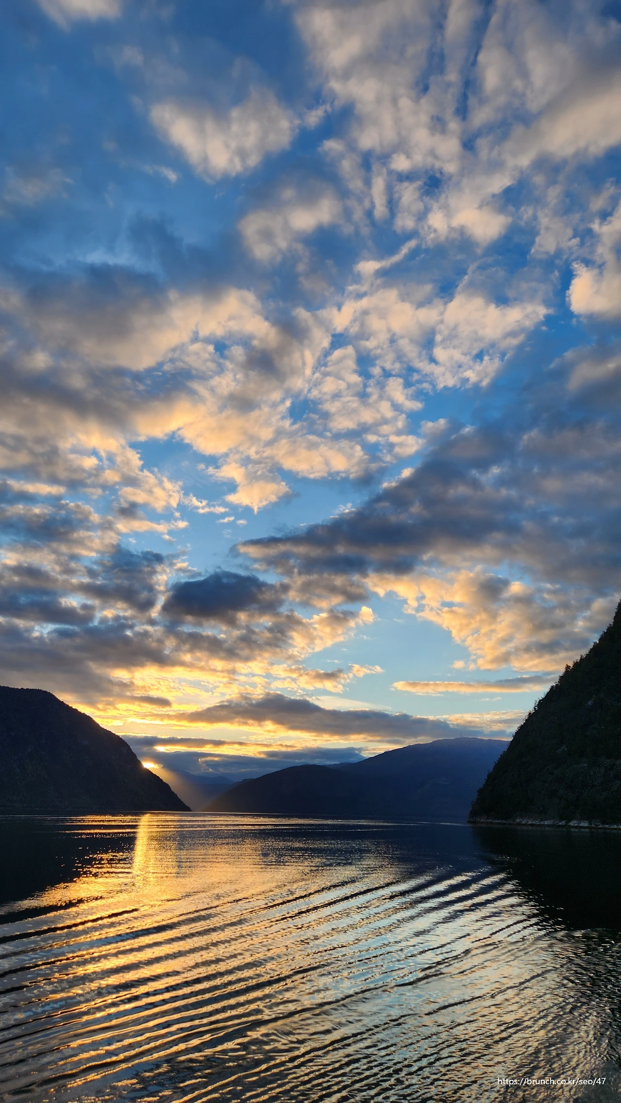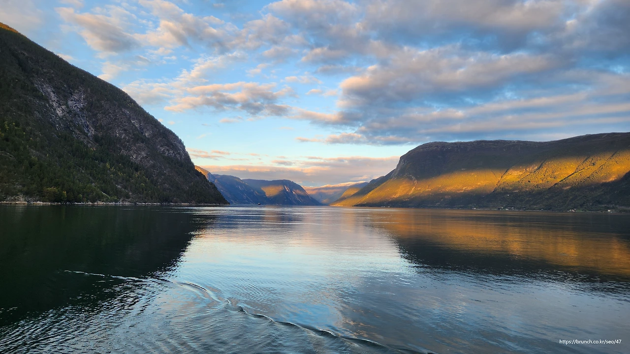 노르웨이에서 가장 길고 깊은 송네 피요르드의 거울처럼 맑고 잔잔한 수면 위로 미끄러지듯 나아간다.