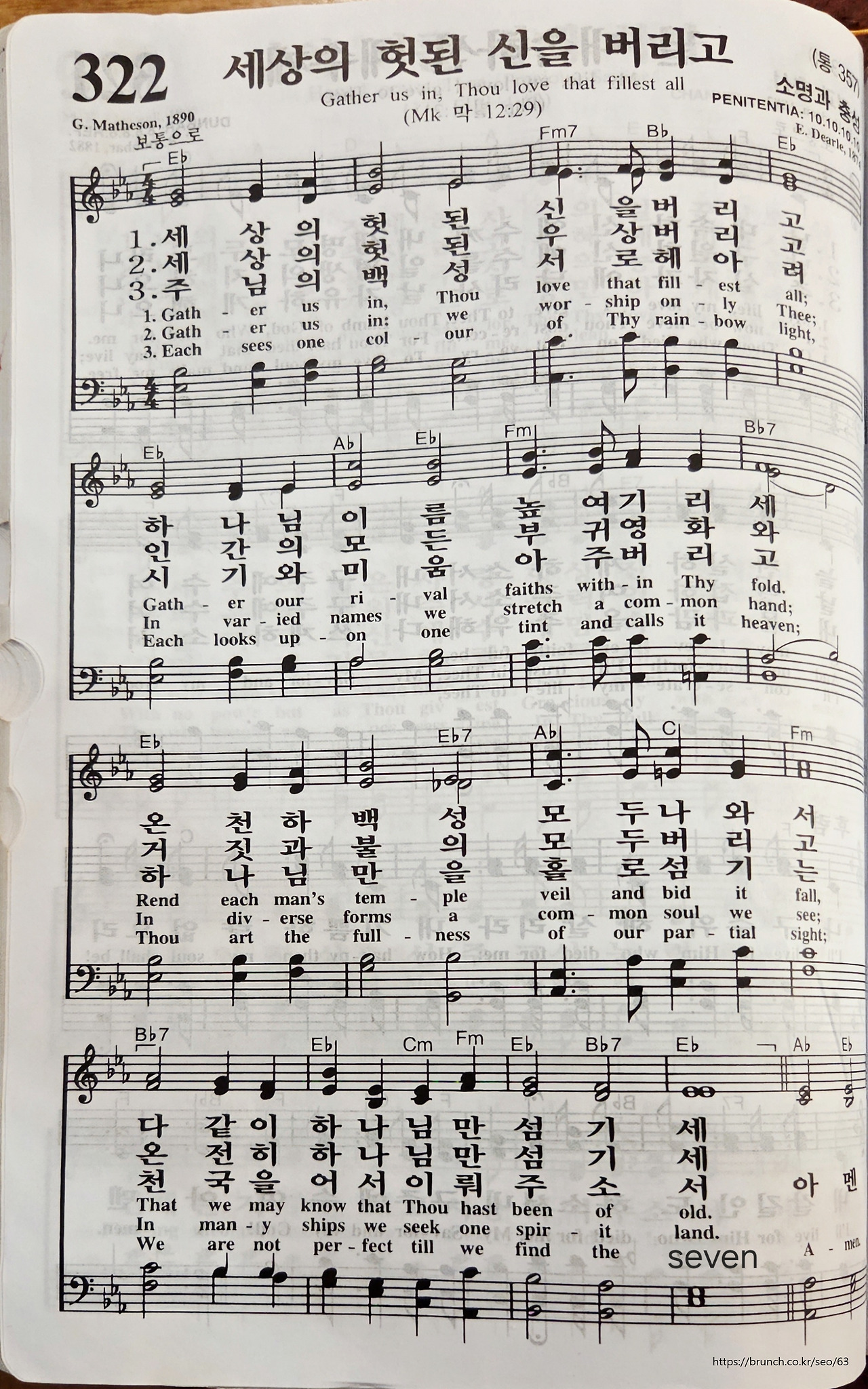 고등학교 시절부터 영어공부를 겸하여 찬송가를 영어 가사로 부르곤 했는데 게르만적인 잔재가 남아있는 예스러운 문체와 행마다 마지막 단어의 각운(rhyme)을 맞추는 영시 특유의 매력이 멋지게 느껴져서 더 좋아했던 것 같다. 그 중에서도 ‘세상에 헛된 신을 버리고’로 번역되어 불리고 있는 찬송가의 3절을 좋아해서 지금도 가끔 흥얼거리는데 음미할수록 내게 통찰과 영감을 준다.