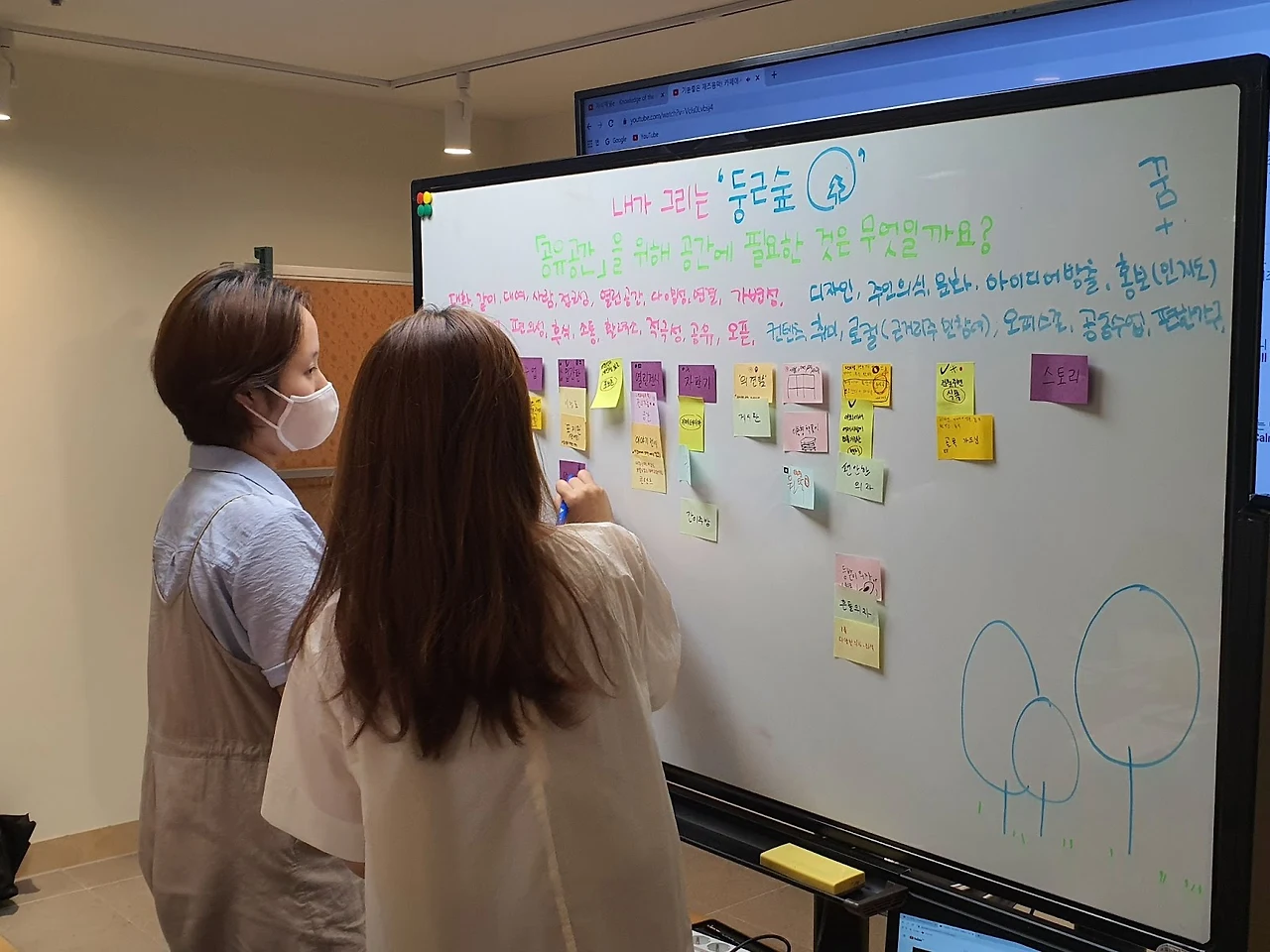 원도심 도시재생 현장지원센터에서 도시재생사업으로 원도심에 ‘둥근숲'이라는 거점공간 조성계획이 있었어요. 제가 공간을 조성하는 과정에서 가장 중요하게 생각하는 것은 사용자의 필요를 꾸준히 파악하고 반영하는 일이에요. 도시재생 사업 담당자분들도 동의하는 지점이어서 공간디자인워크숍을 제안해 주셨어요.