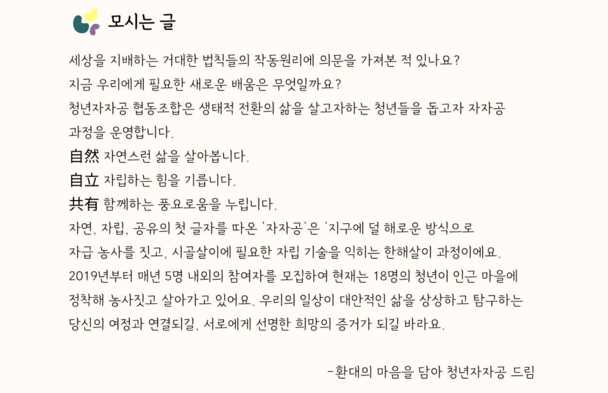 핸내 : 안녕? 자자공은 처음이지! 자자공은 자연, 자립, 공유의 첫 글자를 따온 '자자공'은 지구에 덜 해로운 방식으로 자급 농사를 짓고, 시골살이에 필요한 자립 기술을 익히는 한해살이 과정이야. 2019년부터 매년 5명 내외의 참여자를 모집해 현재는 18명의 청년이 인근 마을에 정착해 농사짓고 살아가고 있어! - 자자공 홈페이지 소개글 중에서 -