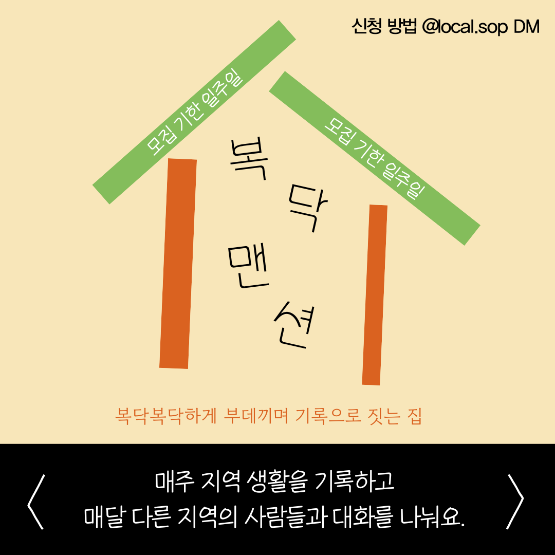 로컬이라는 관심사가 겹치는 사람들을 연결하는 일을 하고 있어요. 로컬생활자로서 여러 지역에서 살아본 경험을 바탕으로 로컬 라이프와 관련된 이야기를 나눌 수 있는 장을 마련하거나 로컬에서 하고 싶은 일을 시도하려는 사람들을 위한 커뮤니티를 운영하고 있어요. 상시 운영 중인 로컬 생활 기록 모임 '복닥맨션', 로컬 생활 고민을 나누는 상담소 '로컬 생활자의 집', 로컬 지향인들이 모여 탐구하고 실천하는 커뮤니티 '로컬 데이즈' 등이 있어요. 지역 간의 경계를 넘어 서로 연대할 수 있는 모임이 마련되었으면 해서 주로 온라인 모임으로 운영하고 있어요.