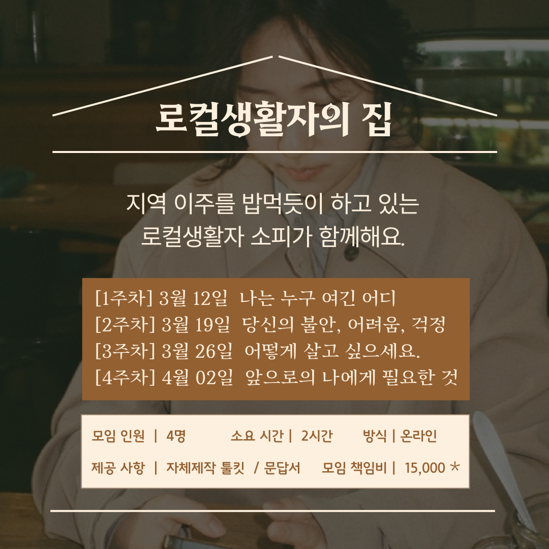 여러 번 이주를 경험하면서 공통적으로 겪은 애로 사항 중 하나가 새로운 지역에서의 삶이 불안해지거나 재미를 잃어버렸을 때 이런 고민을 지역 안에 있는 사람들에게 털어놓기 애매하다는 거였어요. 그렇다고 지역 밖에 있는 친구들은 살아보지 않았으니 공감할 수가 없고요. 지역 살이에 대한 고민을 털어놓을 <로컬금쪽상담소> 같은 곳이 필요하다는 생각이 들었고, 지역을 살고 싶은 곳으로 만들 수 있도록 돕는 로컬 생활 툴킷이나 워크샵을 개발하고 있어요.