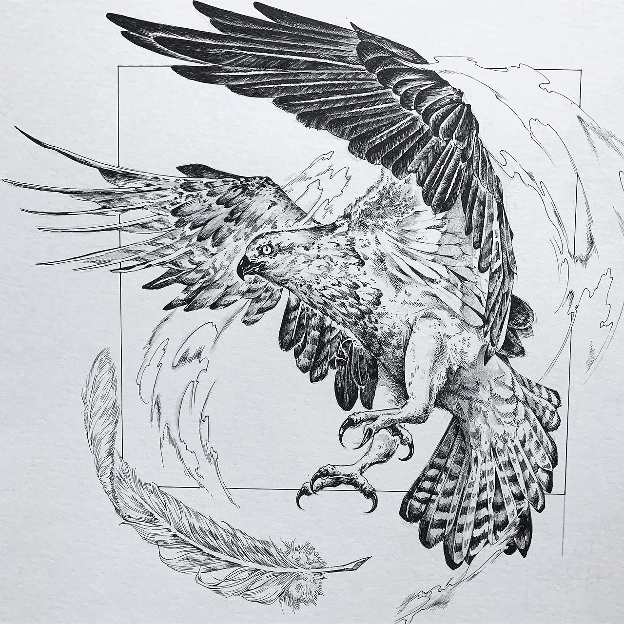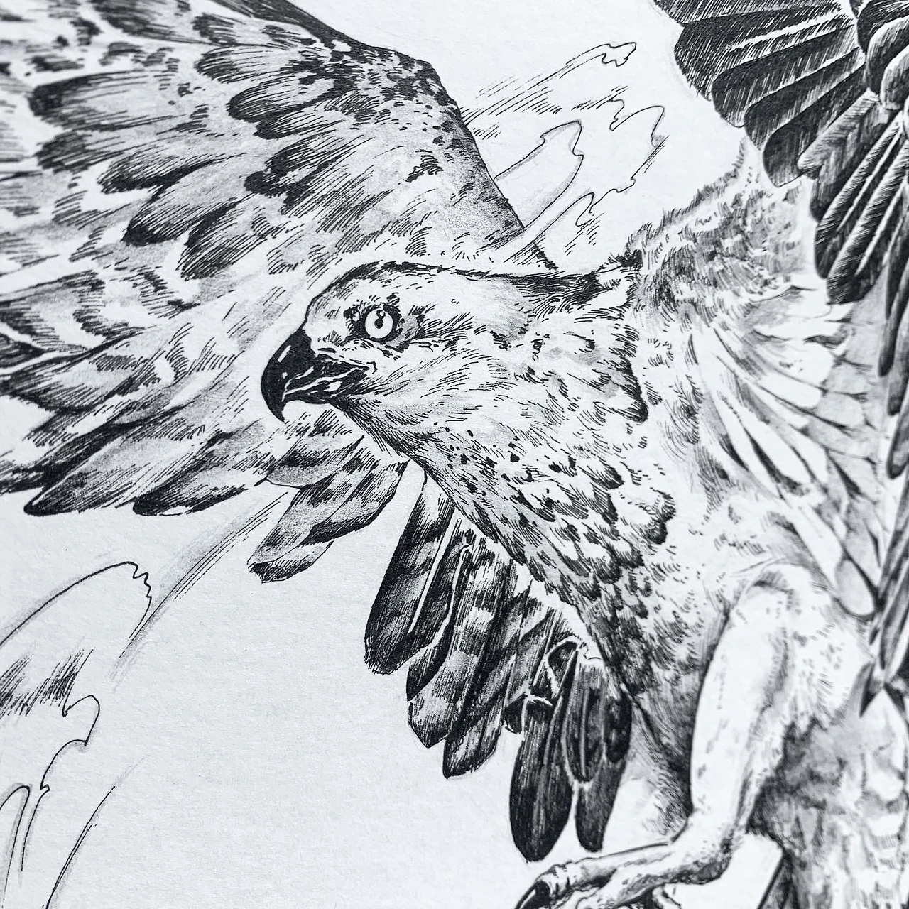 칼로 연필을 깎고, 깨끗한 종이를 화판 위에 올려두고, 연필로 형태를 잡아 그리고, 지우개로 연필선을 정리한다. 도화지에 깔끔한 연필선이 남게 되면 잉크펜으로 깃털 하나하나를 묘사하고, 날갯죽지부터 가장 아래 깃대에 연결되어 있는 커다란 깃털을 향해 결을 따라가도록 표현하고 발가락부터 발톱에 연결되는 근육을 어색하지 않도록 그려 넣는다. 몸통과 날개를 도형으로 보고, 덩어리를 잡아 어두운 면과 그림자가 필요한 면을 찾아 색을 얹어준다. 눈동자에 생기가 드리울 수 있도록 안광을 넣어주고 날개가 펄럭이는 역동적인 모습을 표현하기 위해 눈에 보이는 바람을 그려 넣으면 마무리된다.