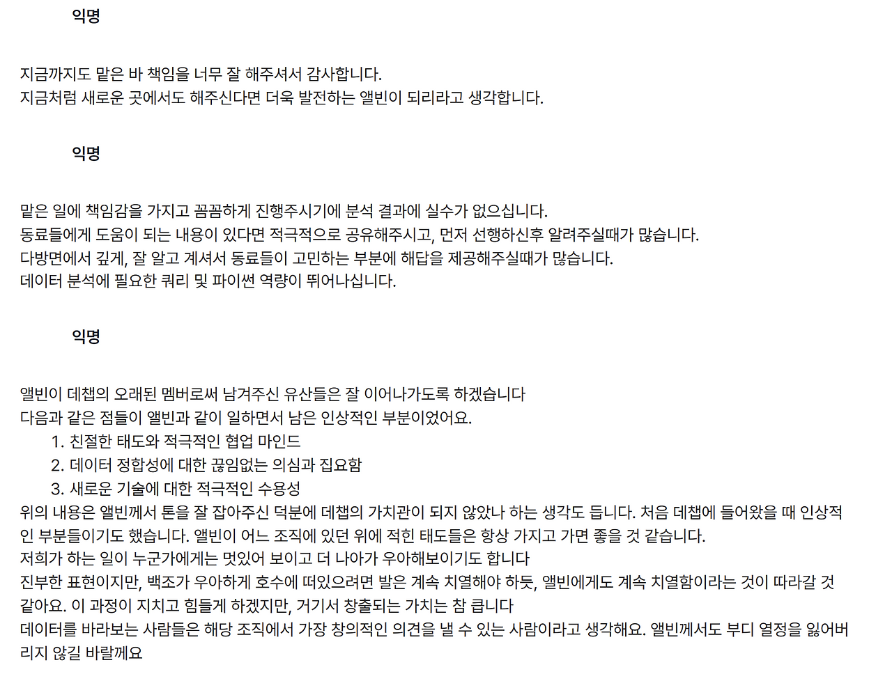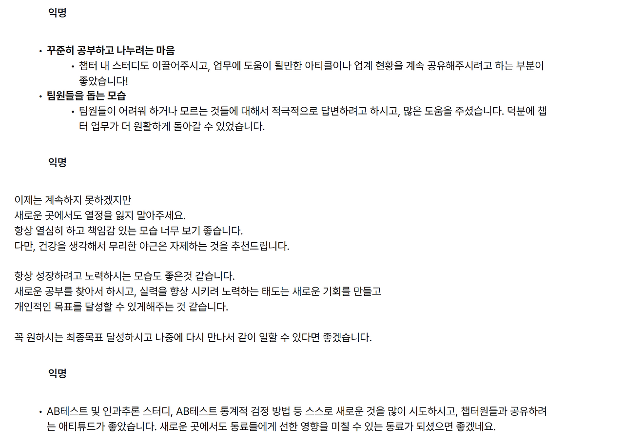 분석가로 일하면서 정말 적극적이고 주체적으로 일했다. 직무 특성상 많은 이해관계자들의 요청을 받기 마련인데 추가적으로 시간을 더 할애해서라도 주체적으로 문제를 발굴하고 인사이트를 뽑아내려 했다. 그 과정에서 프로덕트의 성장만을 생각하며 깊이 몰입하였고 동료들과 밤낮을 가리지 않고 머리를 맞대고 치열하게 고민했다. 또한, 내가 성장해야만 더 높은 수준에서 프로덕트를 바라볼 수 있을 것이란 믿음 때문에 끊임없이 공부하고 실무에 적용하려 했다. 내게 부족한 역량을 갖고 있는 동료가 있다면 다른 직무, 다른 팀이라고 하더라도 티타임을 통해 피드백을 요청하기도 했다. 분석가로서 매일 조금씩 성장하고 문제를 해결하기 위해 머리를 맞대고 치열하게 고민하는 과정들이 힘들면서도 즐거웠다.