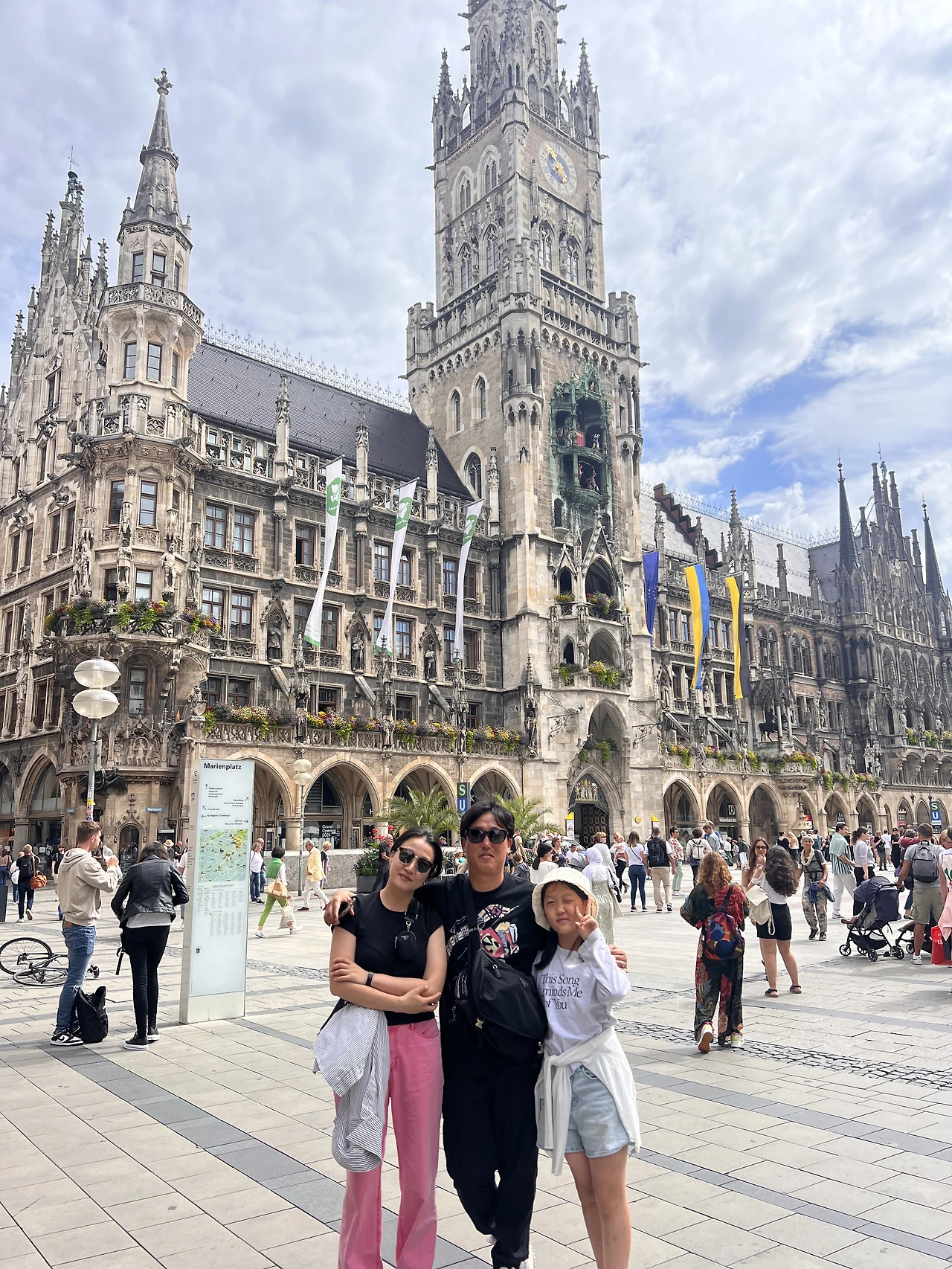 광장을 가득 채운 시청 건물 중간에는 오후 12시가 되면 음악과 함께 인형이 춤을 추는 시계가 있었다. 내가 도착했을 때가 11시 45분쯤이었다. 그 광경을 보려고 그 시간에 도착한건 아니었지만 누구나 할것 없이 손을 뻗어 휴대폰을 들고 무언가를 찍으려고 기다리는 모습을 보고 알았다. 그날은 주말이었고, 많은 관광객들이 시청앞 광장앞을 가득 매우고 있었다. 아주 넓은 광장이었는데 거길 가득채운 사람들이 너도나도 비슷한 포즈로 카메라를 든 모습이 신기했다. 나도도 그들의 무리 속에서 우리도 '이왕 온김에...' 카메라를 들고 영상으로 남겼다. 건물이 너무 커서 멀리 있었음에도 불구하고 그 광경이 카메라에 전부 담기지가 않았다. 우린 웅장한 시청건물 앞에서 사진을 찍기로 했다. 함께간 지인이 있어서 찍어 달라고 했다. 유럽에서 함부러 휴대폰으로 사진을 찍어 달라고 요청했다가 휴대폰을 분실할 우려가 있었기 때문에 아는 지인에게 찍어달라고 요청한 것 이다. 여행에 첫 가족사진이었다.