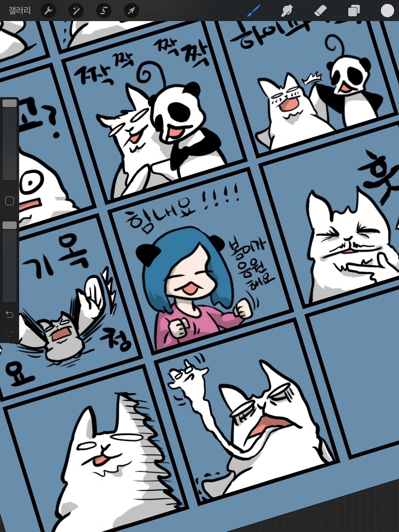 이튿날 아침 아이패드를 보니 완성본이 나와 있었다. 색과 음영이 조화를 이루고 나니 어색한 느낌이 사라져 있었다. 과연 이런 거였나. 셀화 스타일로 작업된 채색은 봄이는 물론 입 속 색 정도만 칠해두었던 판다와 알파카 캐릭터에도 입체감을 보여주고 있었다. 농이 아니라 새삼 내가 그린 그림이 괜히 달라 보였다. 과연, 똑같은 도구를 쥐고도 디테일이 완전히 다른 그림을 그리는 게 이 사람이었다.
