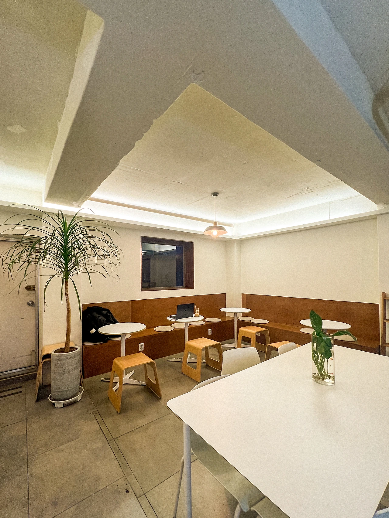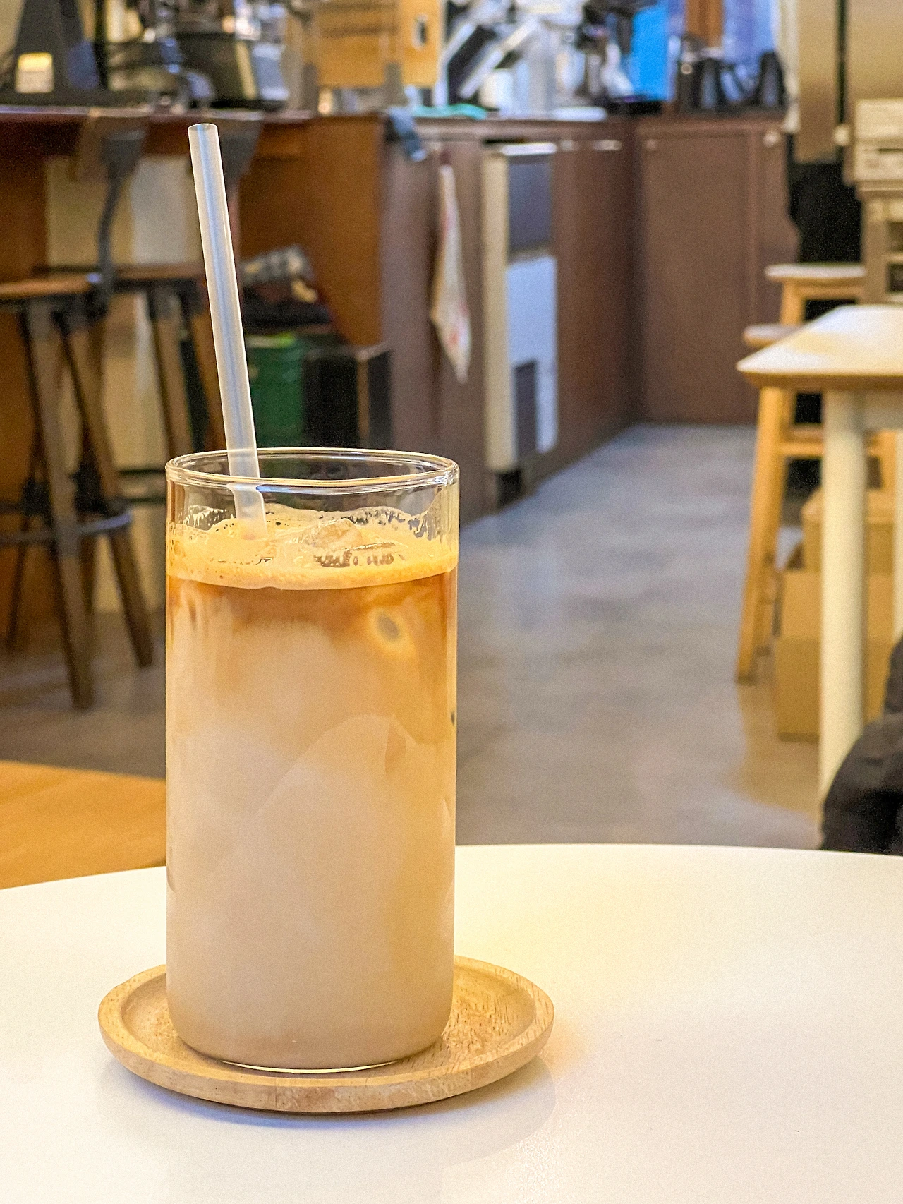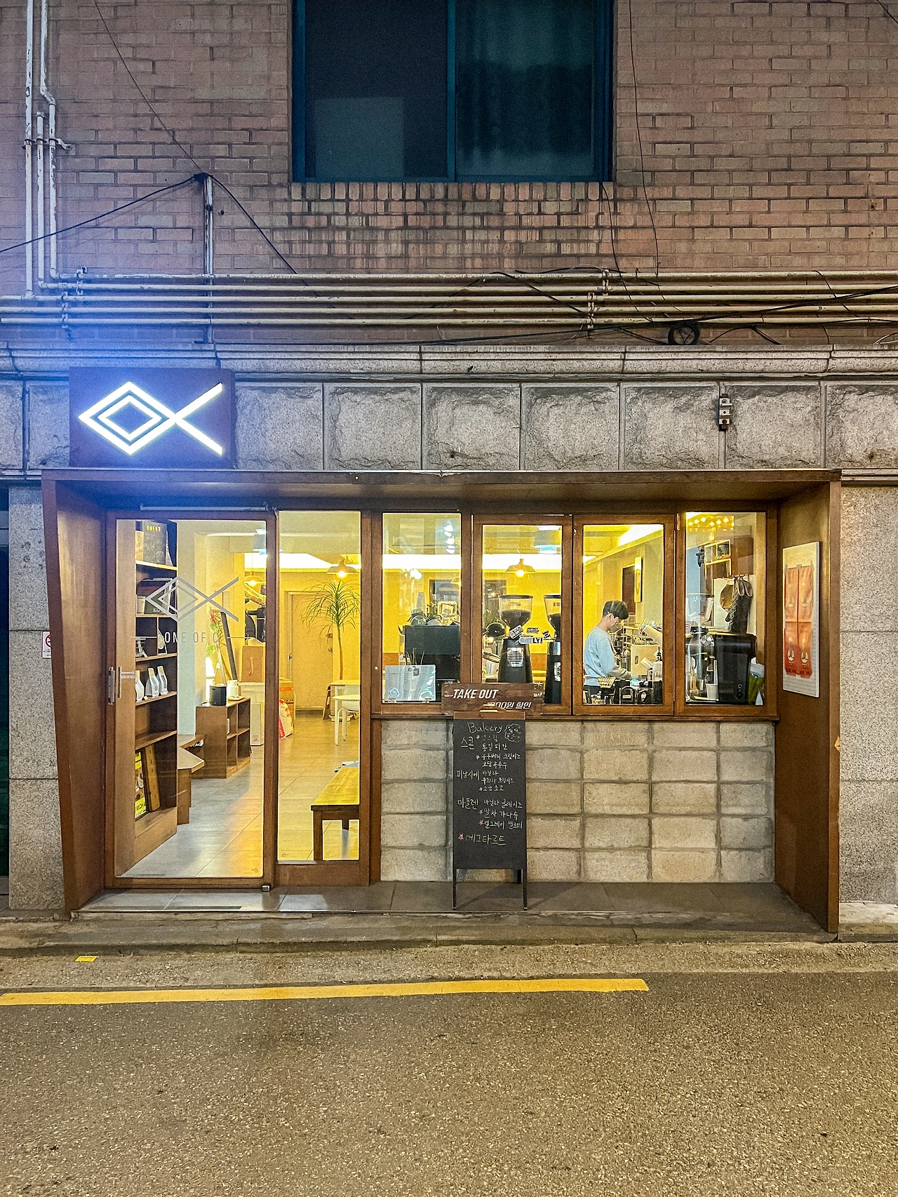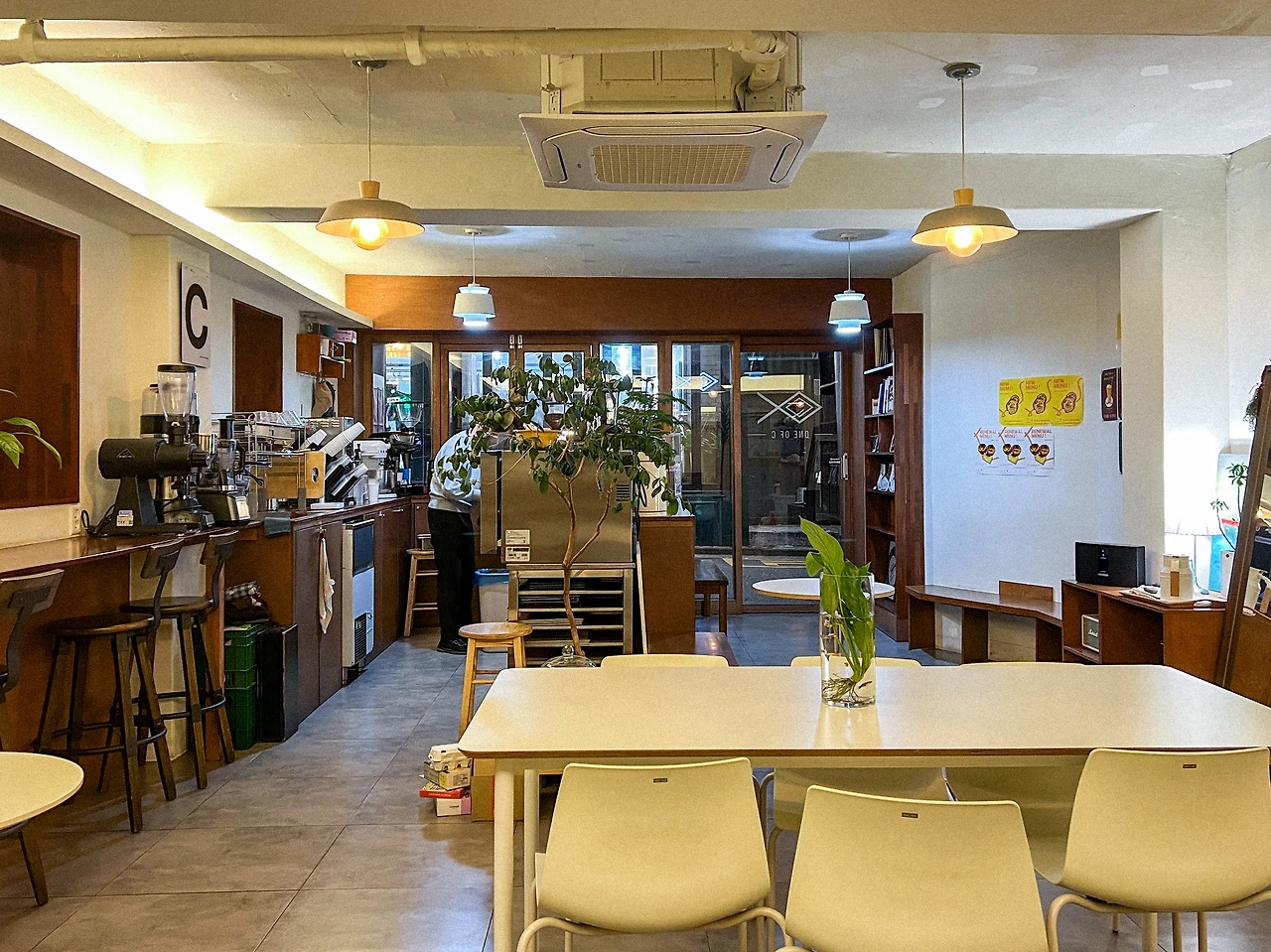 동교동 삼거리 버스 정류장에서 신촌 방향으로 건너 자취방이 밀집된 창천동 골목 방면, 따뜻한 목재로 외관이 마감된 카페 ‘one of c’가 있습니다. 우연히 발견한 카페에서 물고기 로고가 그려진 미닫이 유리문을 열면 익숙한 듯 편안한 공간이 먼저 반깁니다.
