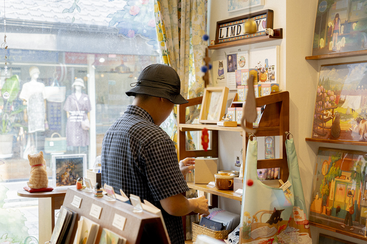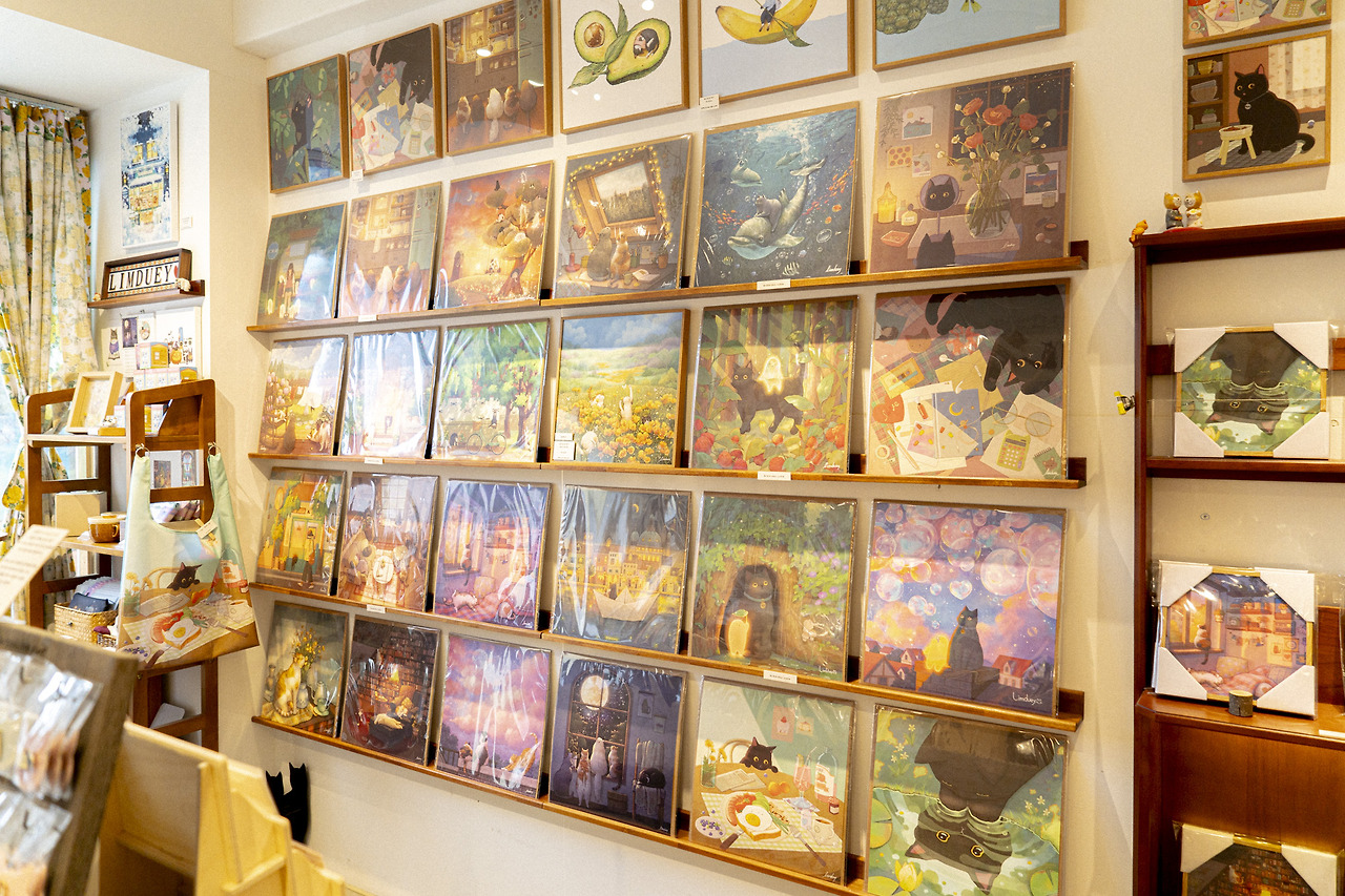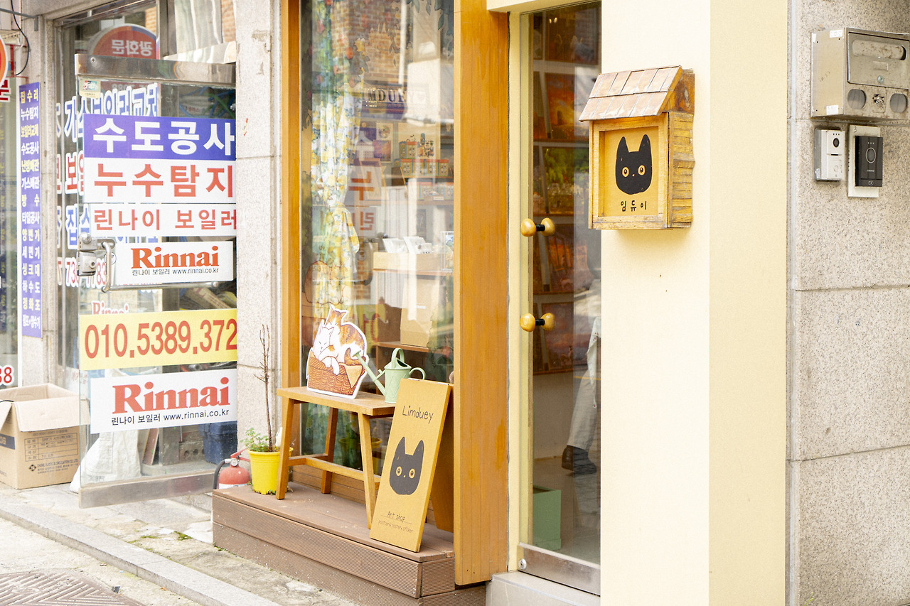 아트숍 임듀이는이는 동명의 일러스트 작가 임듀이님이 운영하는 쇼룸이자 작업실로, 매대마다 작가님의 작품이 가득 진열되어 있다. 임듀이 작가님은 반려묘 ‘먼지’와 ‘누룽지’ 두 마리의 고양이와 여러 고양이에게 영감받은 고양이 작품을 그려낸다. 작품 속 고양이들은 저마다 한껏 늘어져 편안하게 빵을 굽거나 호기심 어린 눈으로 무언가를 응시하고 있다. 저마다 행복한 표정이다.