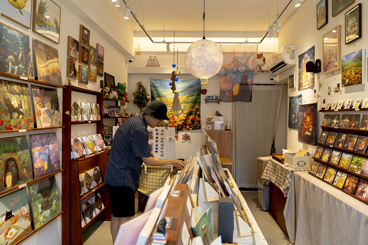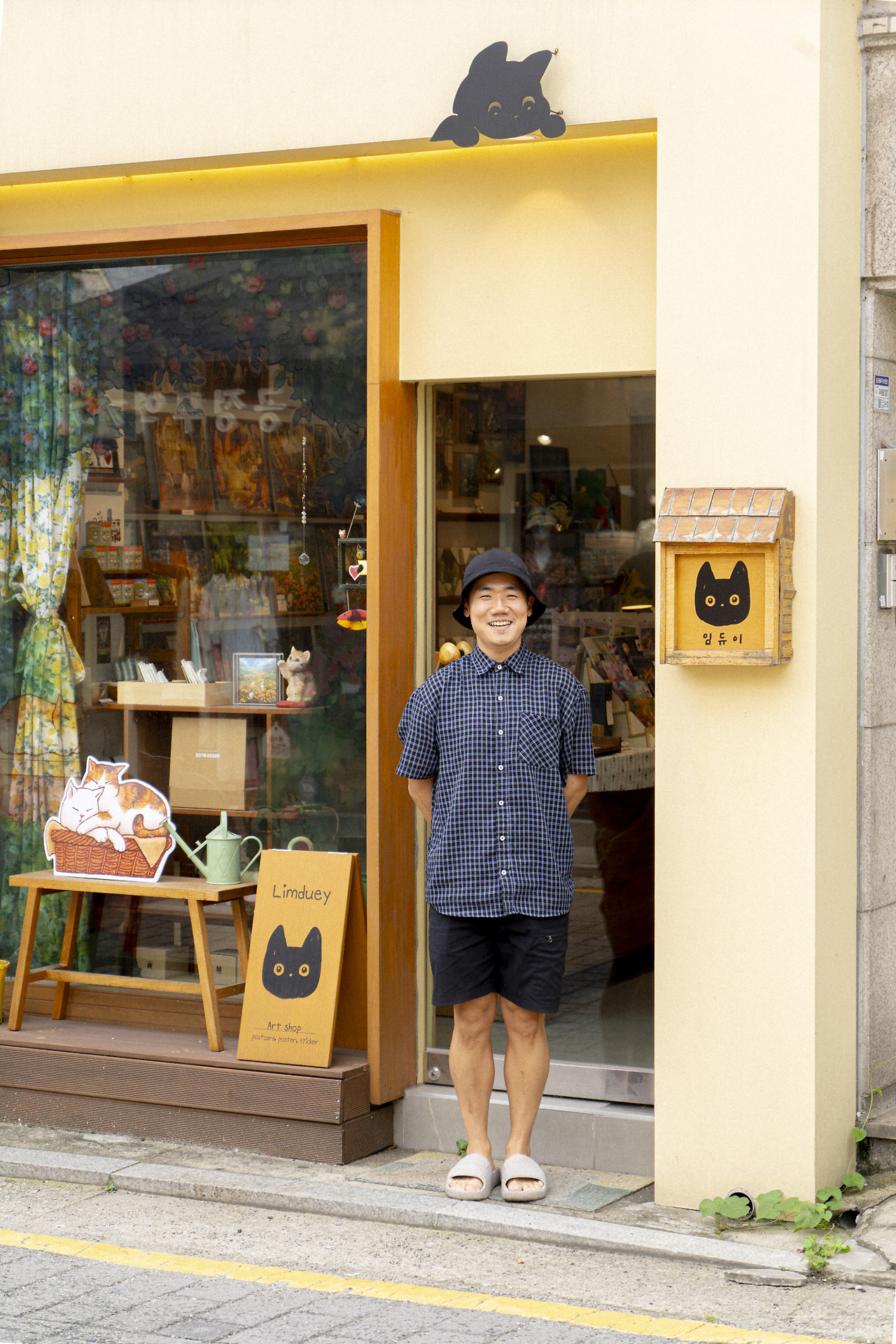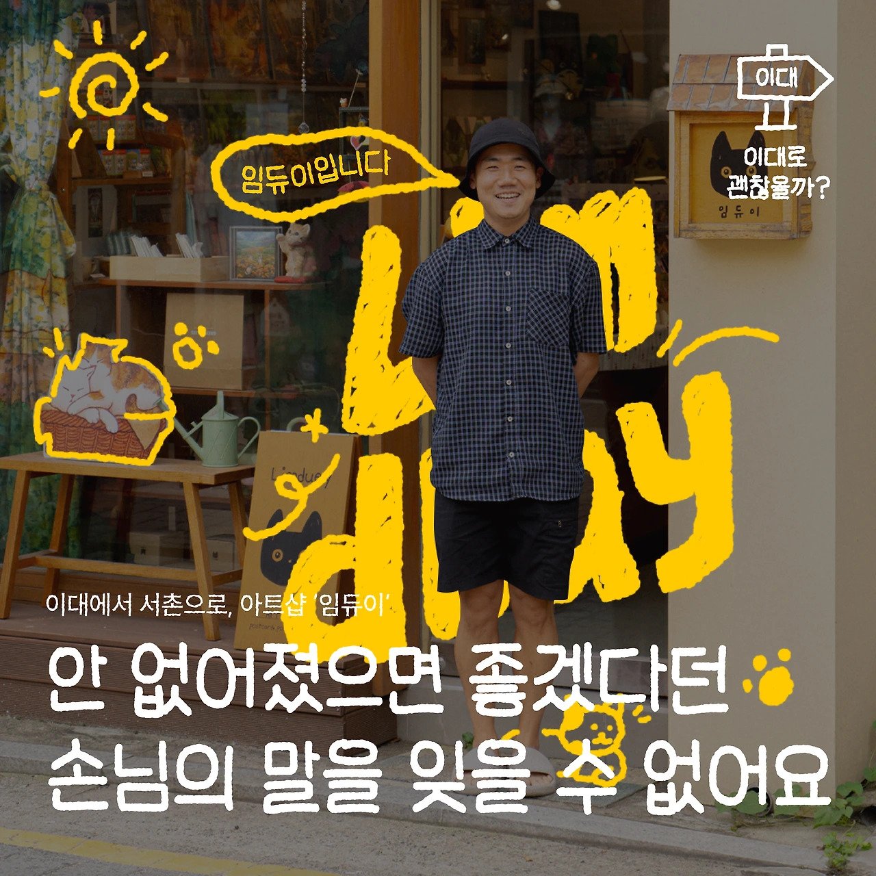 아트숍 임듀이는이는 동명의 일러스트 작가 임듀이님이 운영하는 쇼룸이자 작업실로, 매대마다 작가님의 작품이 가득 진열되어 있다. 임듀이 작가님은 반려묘 ‘먼지’와 ‘누룽지’ 두 마리의 고양이와 여러 고양이에게 영감받은 고양이 작품을 그려낸다. 작품 속 고양이들은 저마다 한껏 늘어져 편안하게 빵을 굽거나 호기심 어린 눈으로 무언가를 응시하고 있다. 저마다 행복한 표정이다.