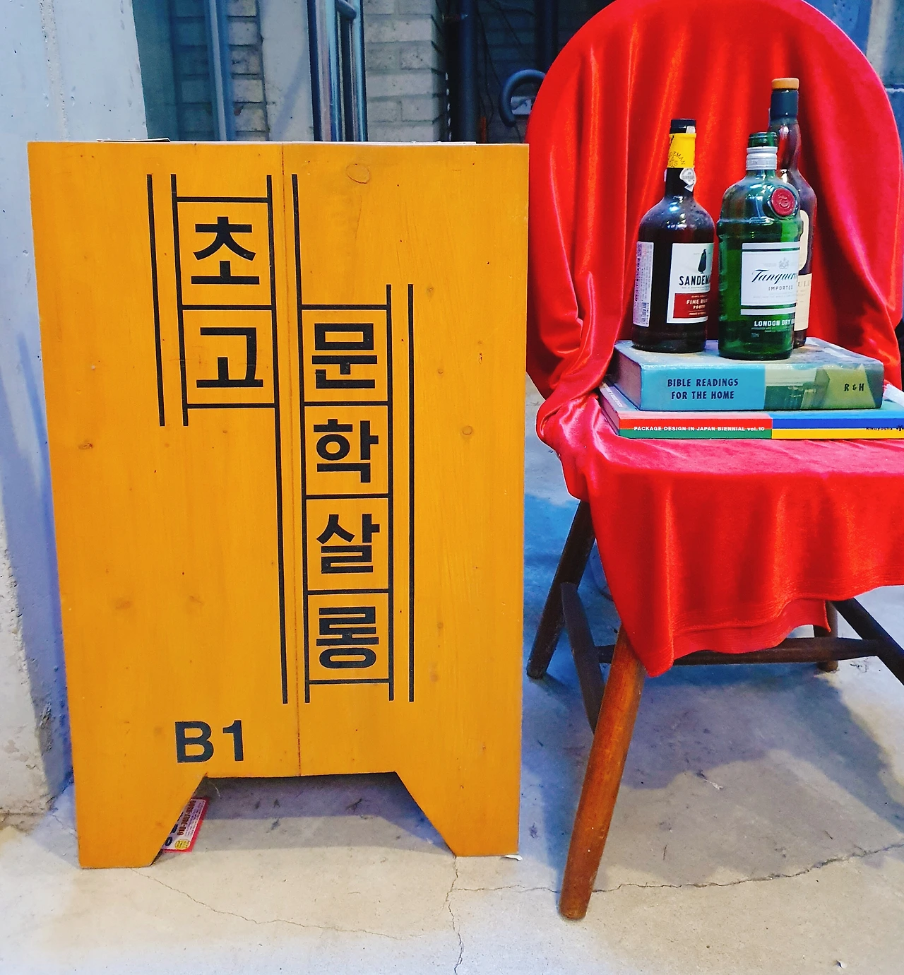 문학살롱 초고를 찾는 누구든, 처음 이 집에 들어올 때는 어떤 신비한 마음을 갖게 된다. 그건 입구 동선의 영향이 큰데, 나는 이런 구조의 술집은 초고에서밖에 보지 못했다. 반지하에 자리잡은 이 술집의 문은 안쪽이 들여다보이지 않는 캄캄한 모양새인데, 문을 열면 안의 구조를 한번에 파악할 수 없도록 들어가는 길이 구불구불 꺾어져 있다. 입장객은 문을 열고 오른쪽으로 몸을 틀었다가 미로같은 길을 따라서 다시 왼쪽으로 돌게 되는데, 그러면 주인이 직접 골라 비치해둔 책들이 보이고(파는 것들이다.) 그 길의 끝에 다다라서 오른쪽으로 몸을 틀어야만 비로소 펍 내부에 들어올 수가 있다. 실제로 방문해보면 그렇게까지 복잡한 구조는 아니지만, 아무튼 독특하며 이를 경험하기 위해서는 직접 와보는 수밖에 없다.