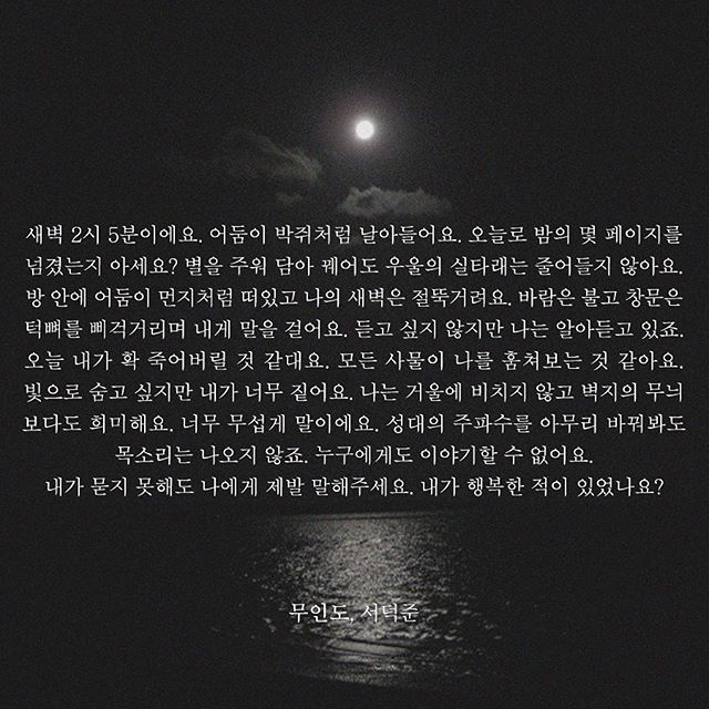 새벽 2시 5분이에요. 어둠이 박쥐처럼 날아들어요. 오늘로 밤의 몇 페이지를 넘겼는지 아세요? 별을 주워 담아 꿰어도 우울의 실타래는 줄어들지 않아요. 방 안에 어둠이 먼지처럼 떠있고 나의 새벽은 절뚝거려요. 바람은 불고 창문은 턱뼈를 삐걱거리며 내게 말을 걸어요. 듣고 싶지 않지만 나는 알아듣고 있죠. 오늘 내가 확 죽어버릴 것 같대요. 모든 사물이 나를 훔쳐보는 것 같아요. 빛으로 숨고 싶지만 내가 너무 짙어요. 나는 거울에 비치지 않고 벽지의 무늬보다도 희미해요. 너무 무섭게 말이에요. 성대의 주파수를 아무리 바꿔봐도 목소리는 나오지 않죠. 누구에게도 이야기할 수 없어요.